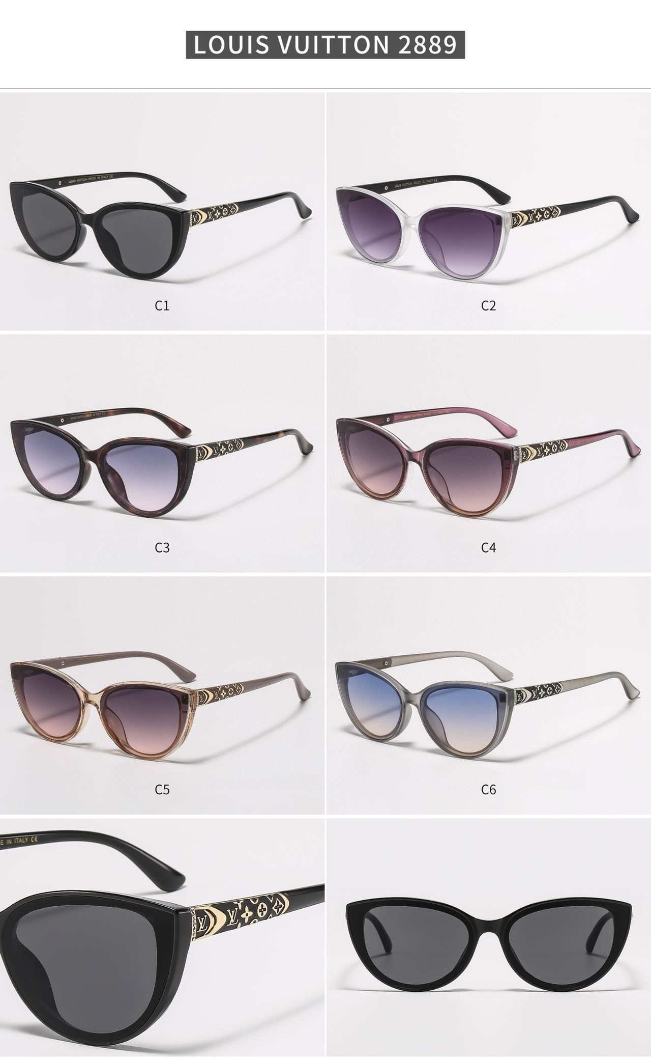 Elevate your accessory collection with Louis Vuitton’s sunglasses (Model 2889). Featuring a range of stylish cat – eye options—from classic black and gradient purple lenses to designs with tortoiseshell, pink, brown, and blue frames, all adorned with the iconic LV monogram detailing on the temples—these sunglasses blend a chic silhouette with the brand’s signature luxury.