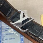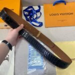 This Louis Vuitton V-shaped buckle black crocodile pattern belt is made of rare black leather, showing unparalleled luxury and nobility. The surface of the belt has clear texture and high gloss. You can feel its delicate texture and comfortable touch every time you touch it. The unique metal “LV” logo is inlaid on the belt buckle head, which is simple and elegant, highlighting the unique charm of the brand.