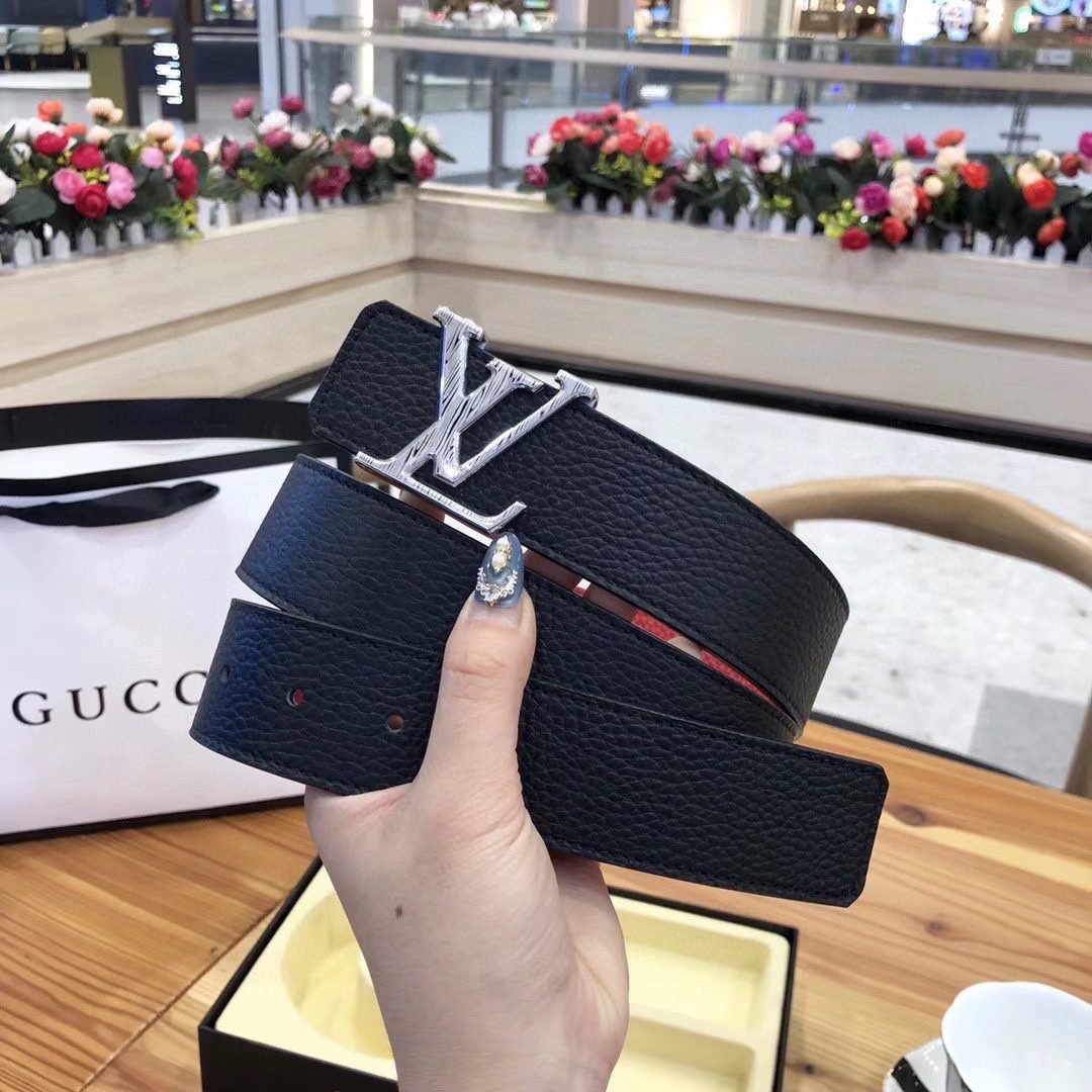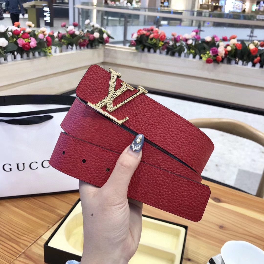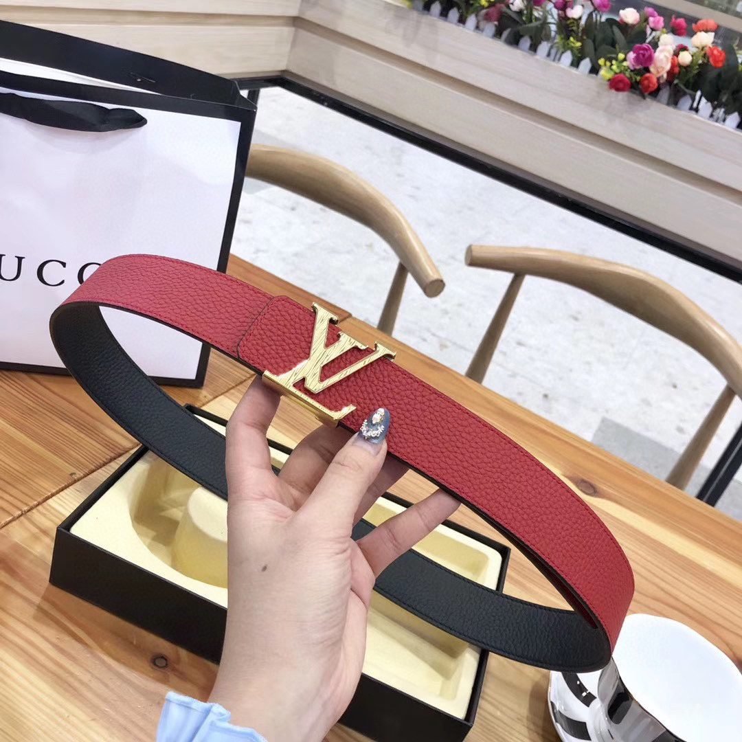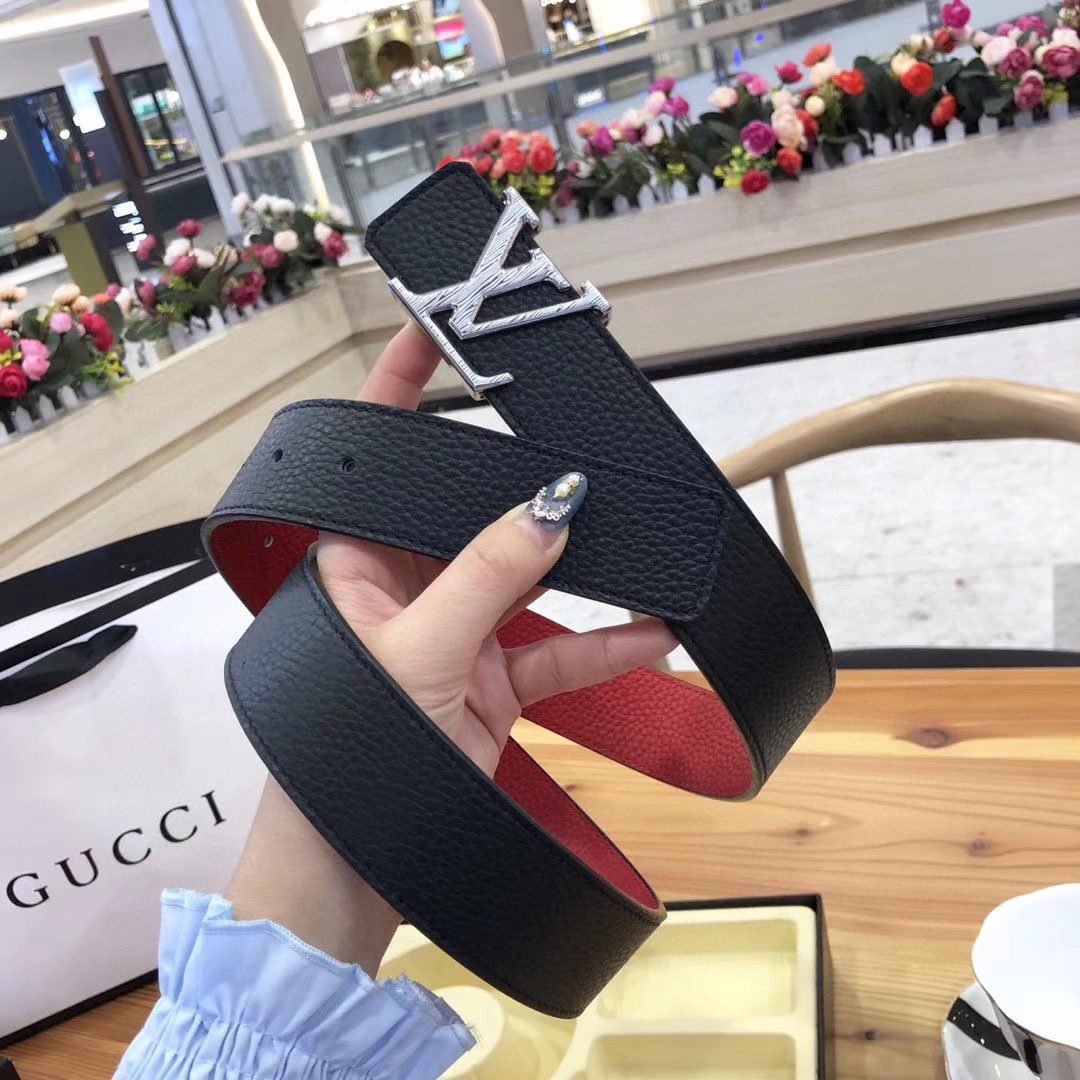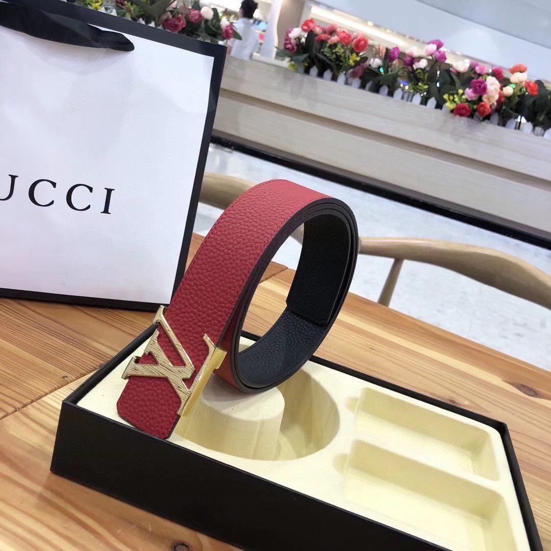 This Louis Vuitton V-buckle double-sided belt cleverly combines bright red with elegant black, blooming with unparalleled charm. Selected top-grade leather material and carefully crafted by craftsmen, showing a smooth and delicate touch while having excellent durability. The metal LV logo on the belt buckle is simple yet noble, highlighting the wearer’s unique taste and extraordinary identity. The belt can be used on both sides.