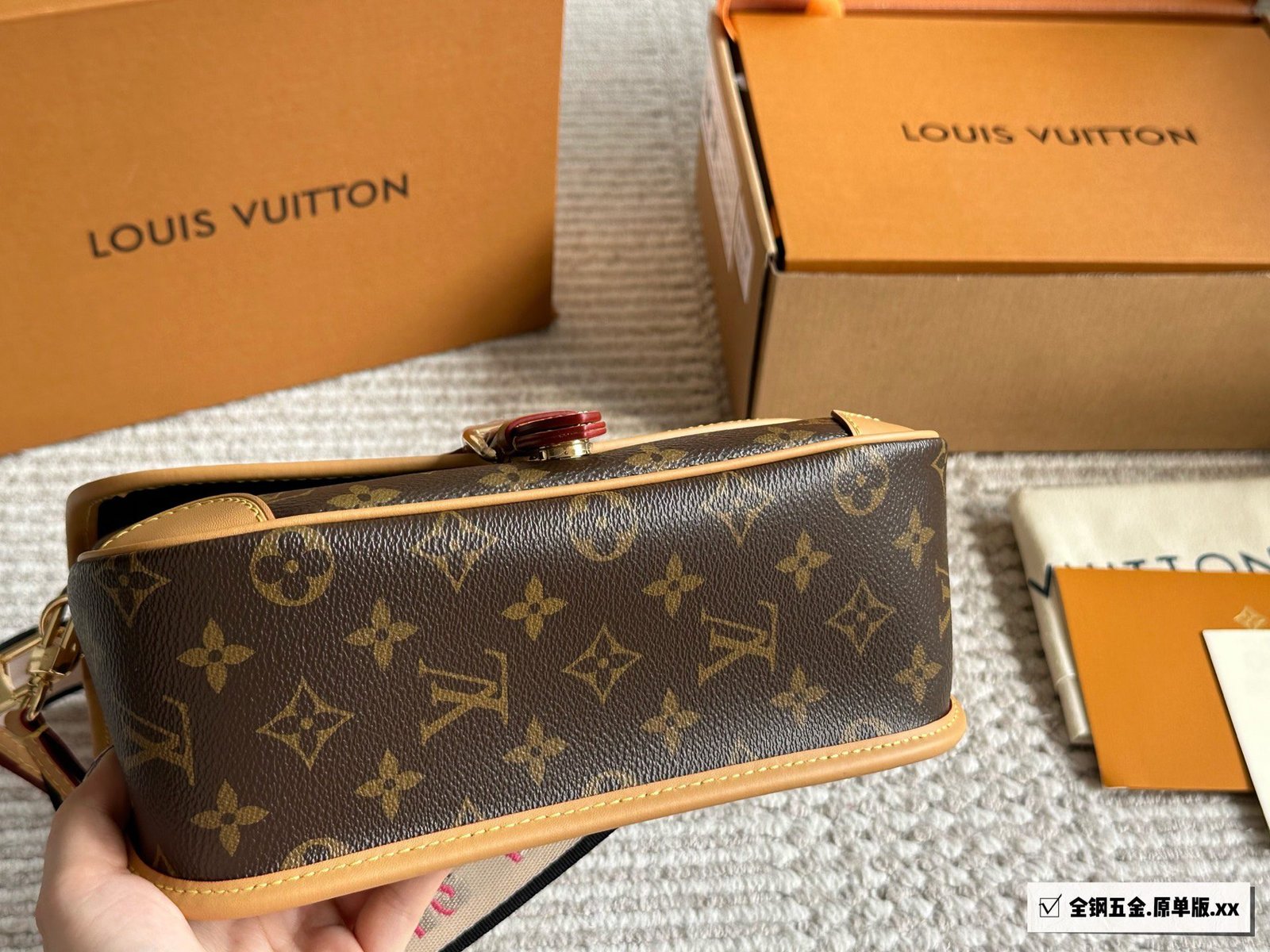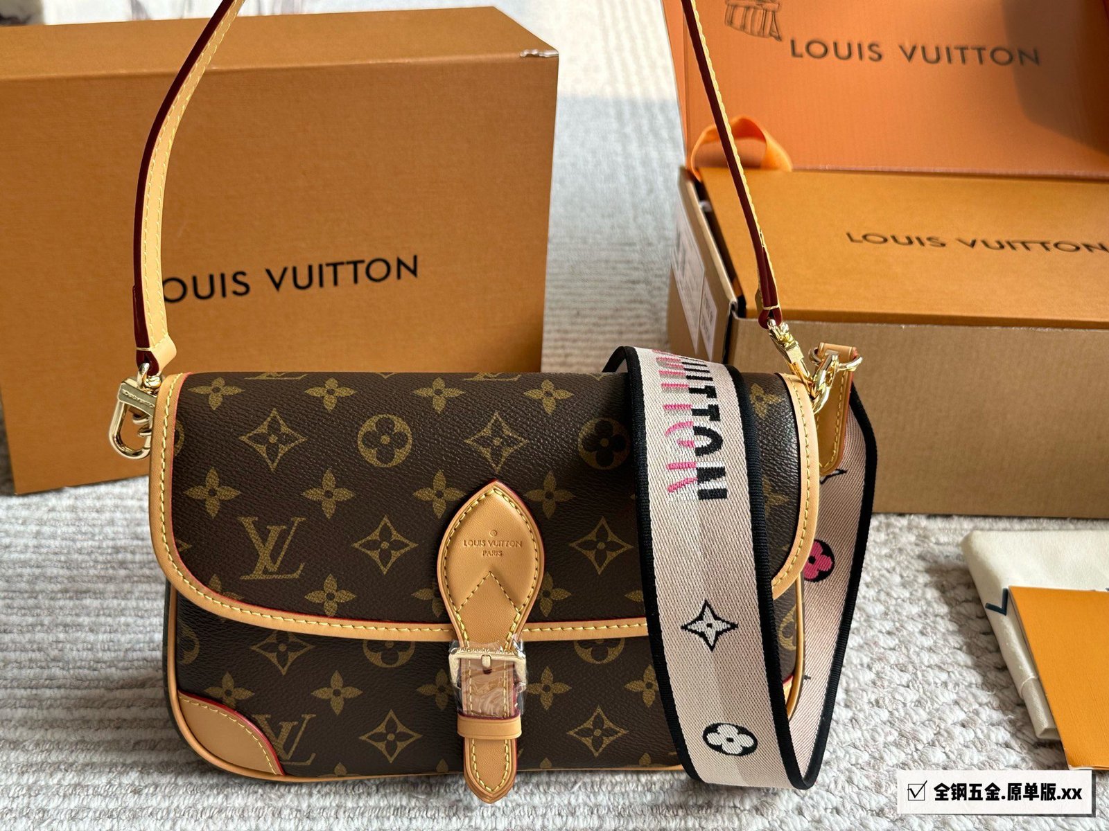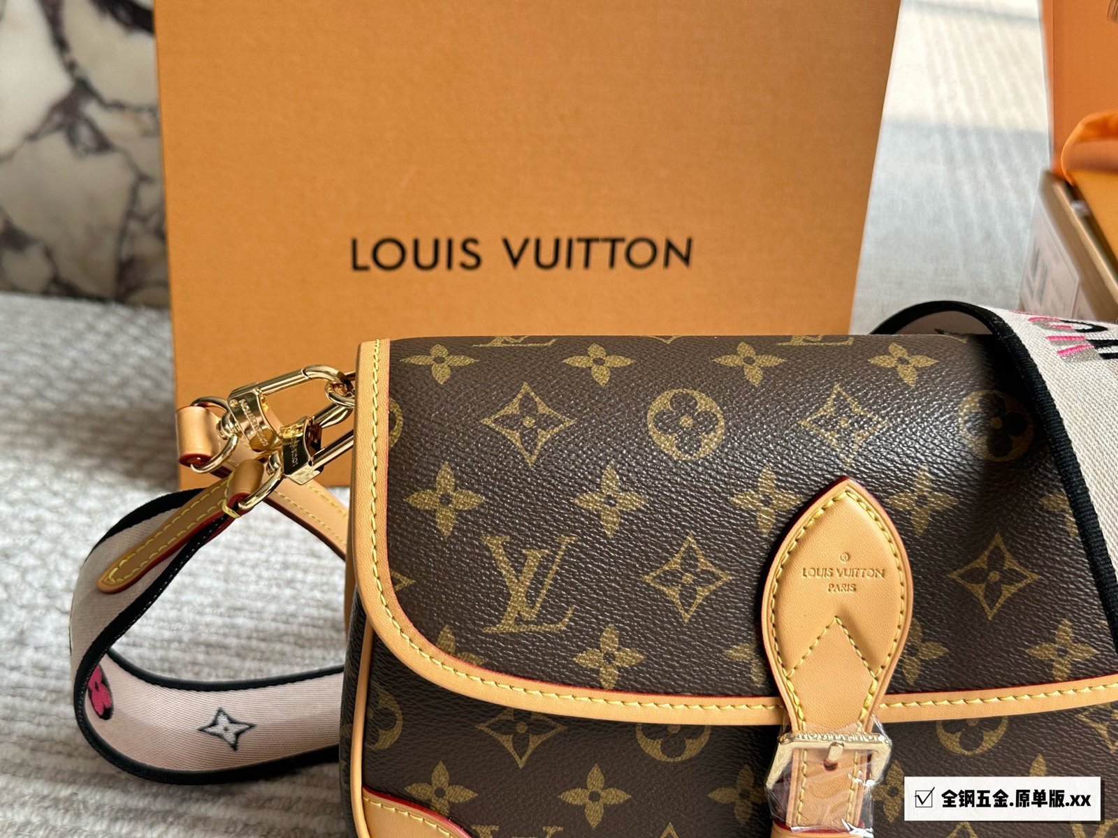 ✨ The iconic LV Diane messenger bag features the signature Monogram canvas paired with natural leather trim. The vintage flap and metal clasp design evokes French elegance, and it comes with two interchangeable straps: a classic leather strap and a printed wide strap, allowing for both shoulder and crossbody wear.