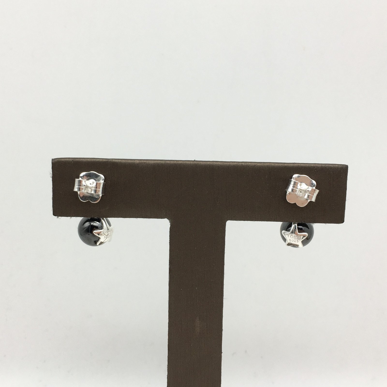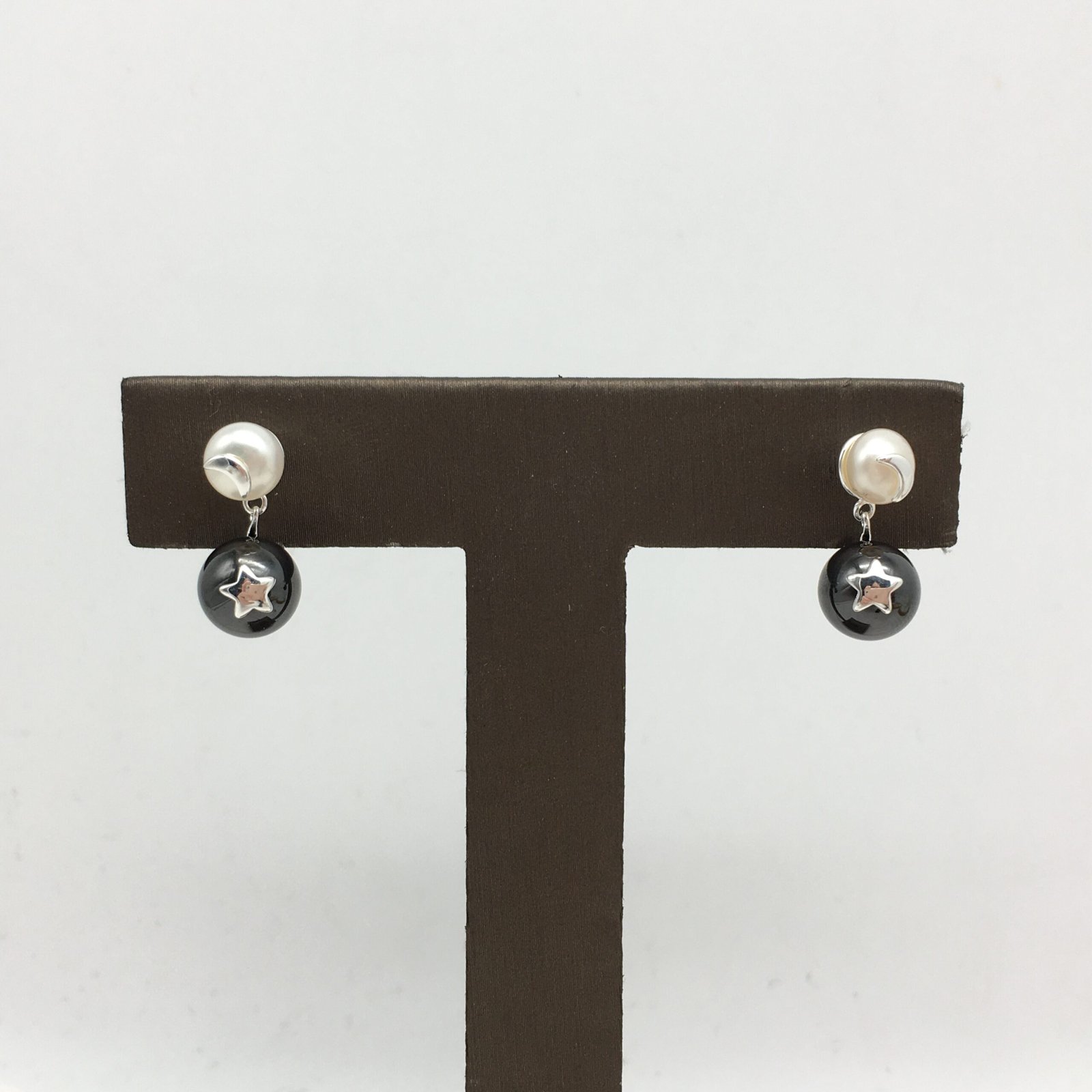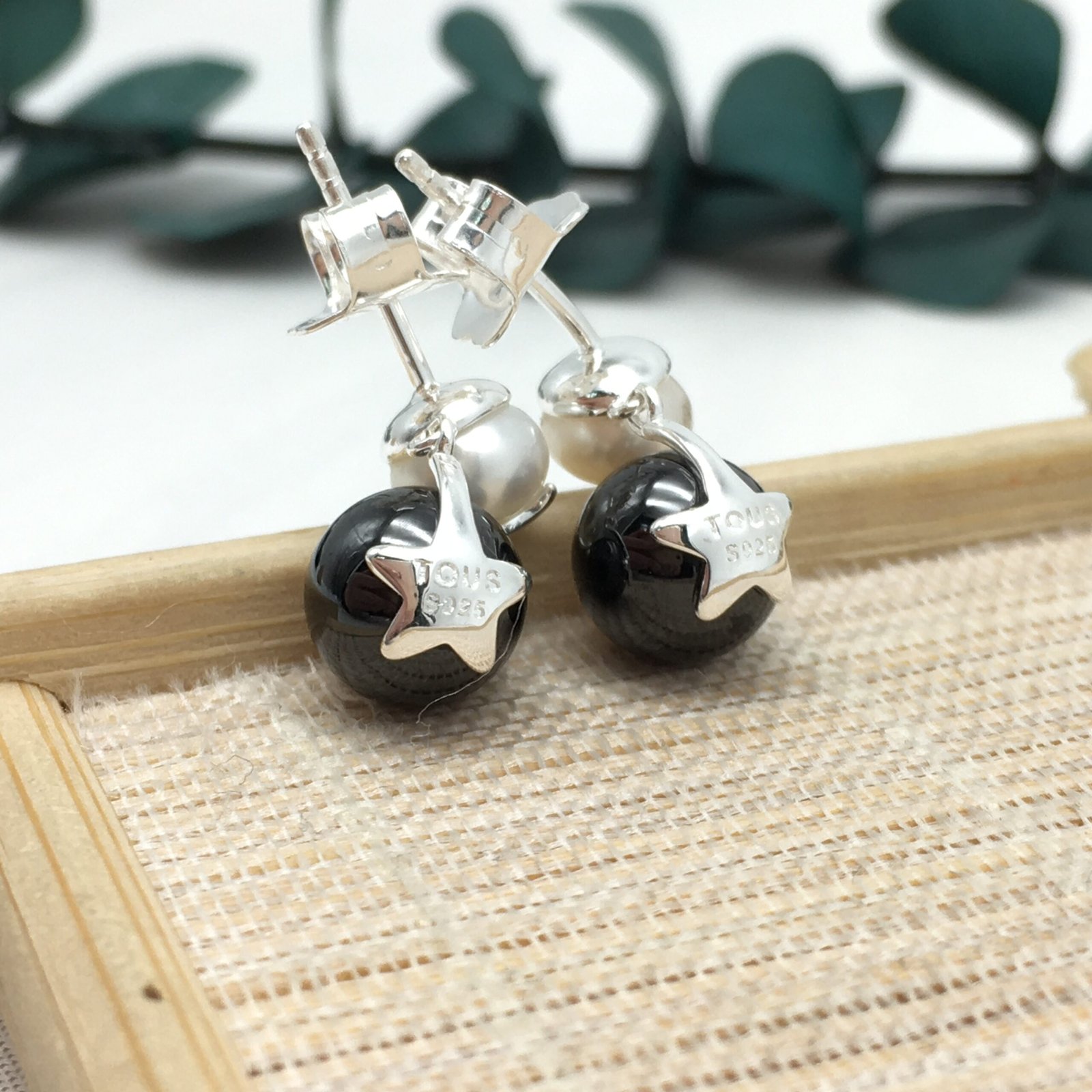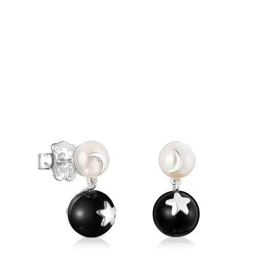 TOUS Magic Nature earrings in sterling silver with 6 mm cultured freshwater pearl with moon and 8 mm onyx with star. Push back. Production technique: Casting.