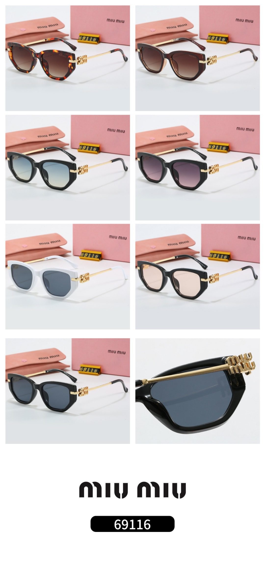 The Miu Miu 69116 series sunglasses are rich and diverse in styles. Retro tortoiseshell pattern, classic black, fresh white, etc., each has its own unique features. The exquisite metal decorations are integrated with the unique frame shape, full of fashion sense. Whether you go out on the street daily or on special occasions, wearing it can easily show your exclusive fashion attitude~