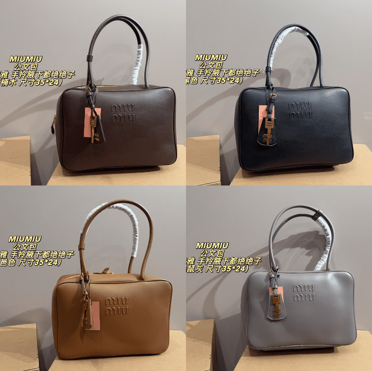 This Miu Miu leather briefcase bag collection features the brand’s subtle embossed logo and refined design, crafted from premium leather with a structured silhouette of 35×24cm. Embodying Miu Miu’s legacy of understated luxury and professional chic, the bags are available in elegant hues like brown, black, tan, and gray, with thoughtful details like charm accents and structured handles. Merging timeless sophistication with practical functionality, they’re perfect for those who appreciate distinct branding, meticulous craftsmanship, and a statement piece that elevates workwear and beyond—adding a touch of polished elegance to any ensemble with undeniable refinement.