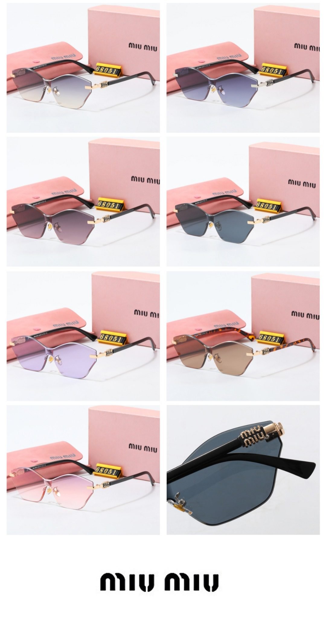 Elevate your fashion game with Miu Miu’s stylish sunglasses (Model 88051). Featuring unique frame designs, these sunglasses come in a variety of stunning color options, including gradient shades, solid hues, and tortoiseshell patterns. Each pair showcases exquisite detailing on the temples, embodying Miu Miu’s signature blend of playfulness and luxury. Whether you’re going for a chic casual look or a more sophisticated style, these sunglasses add a touch of glamour to any outfit, making them the perfect accessory for any occasion.