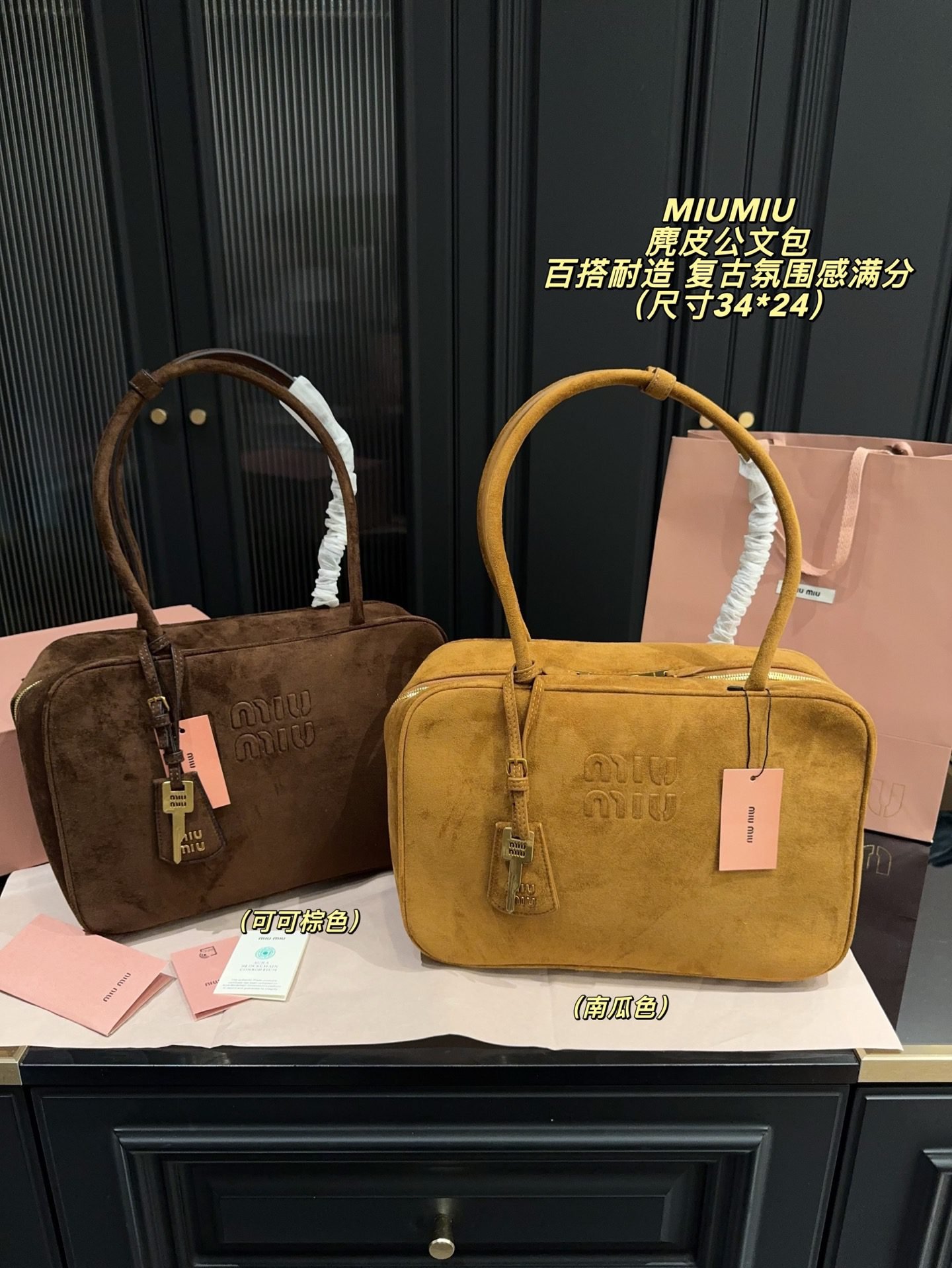 This Miu Miu suede briefcase bag collection features the brand’s embossed logo and retro-inspired design, crafted from premium suede with a structured silhouette of 34×24cm. Embodying Miu Miu’s legacy of vintage charm and tactile sophistication, the bags are available in rich hues like cocoa brown and pumpkin orange, with distinctive charm details that enhance their nostalgic allure. Merging timeless elegance with everyday functionality, they’re perfect for those who appreciate distinct branding, meticulous craftsmanship, and a statement piece that infuses any look with full-bodied retro vibes—ideal for elevating both casual and polished ensembles with undeniable style and character.