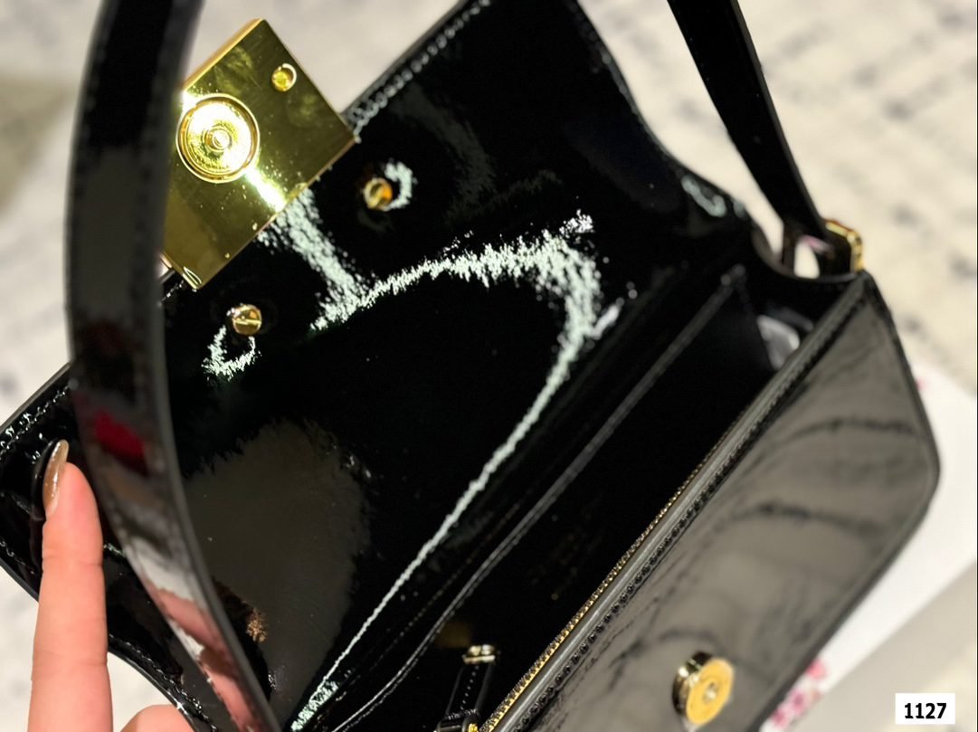 New flip up handbag, with a modern and elegant temperament of classic style. Crafted with black patent leather and cowhide, paired with contrasting fashionable Faurecia metal accents, adorned with the classic features of this collection $85.00