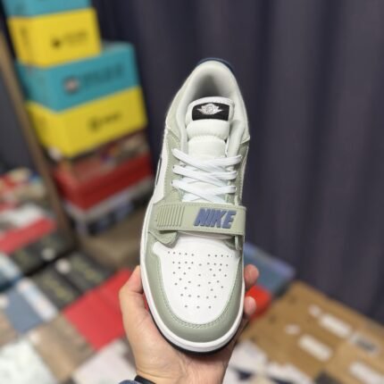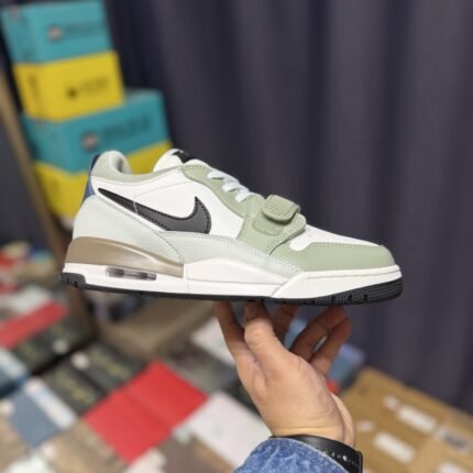 This Nike Air Trainer 1 sneaker features a sophisticated sage green, white, and black color combination, showcasing the iconic silhouette’s