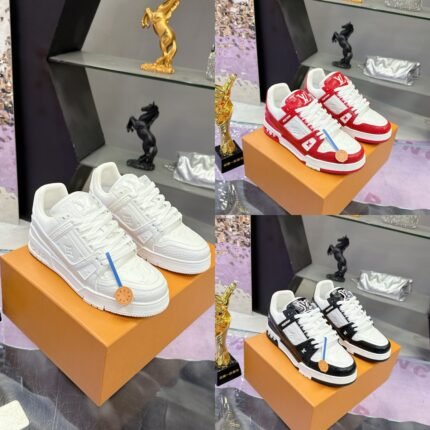 This Louis Vuitton Trainer sneaker collection showcases the brand’s signature monogram detailing, premium materials, and bold color palettes (classic white,