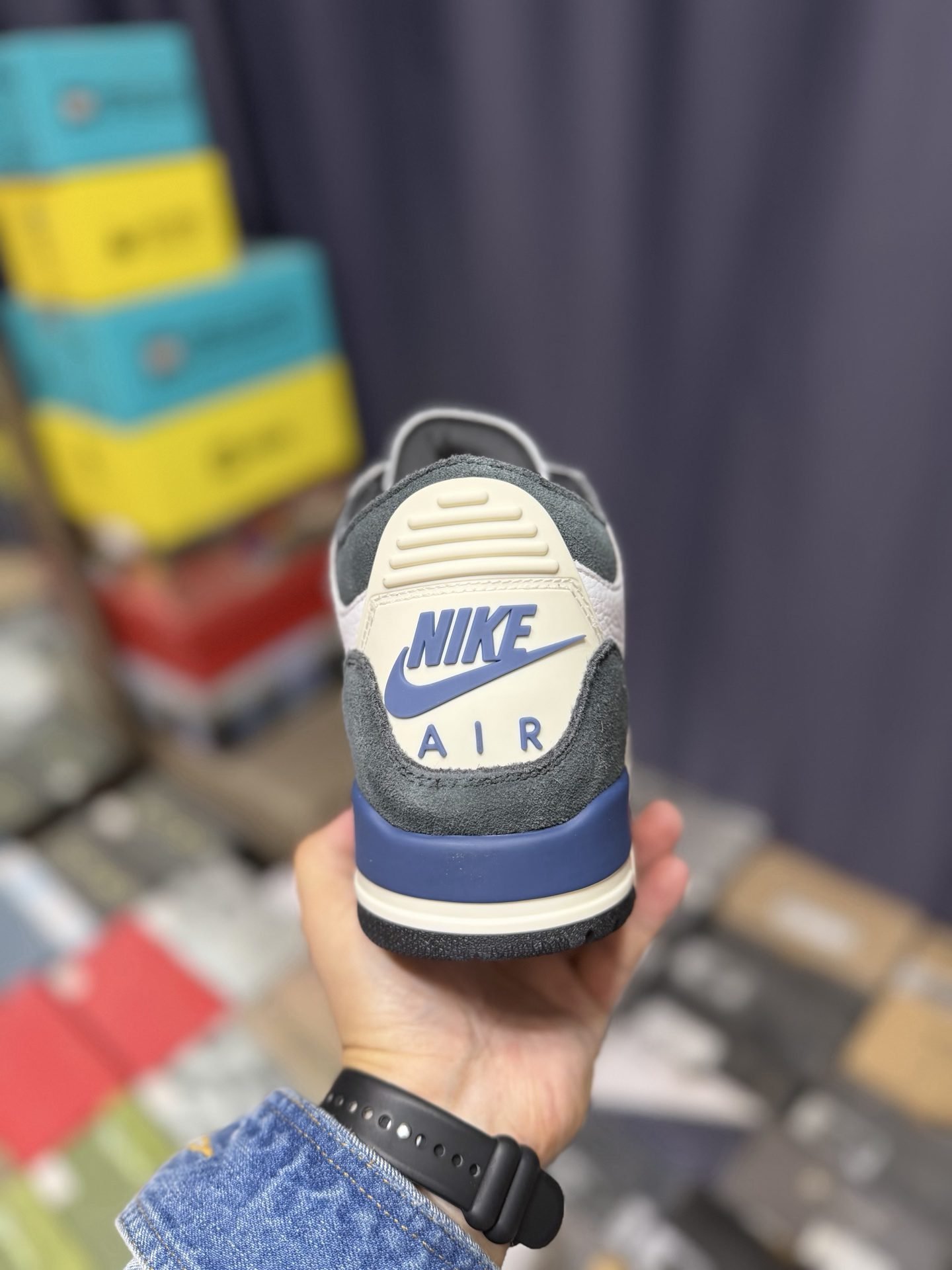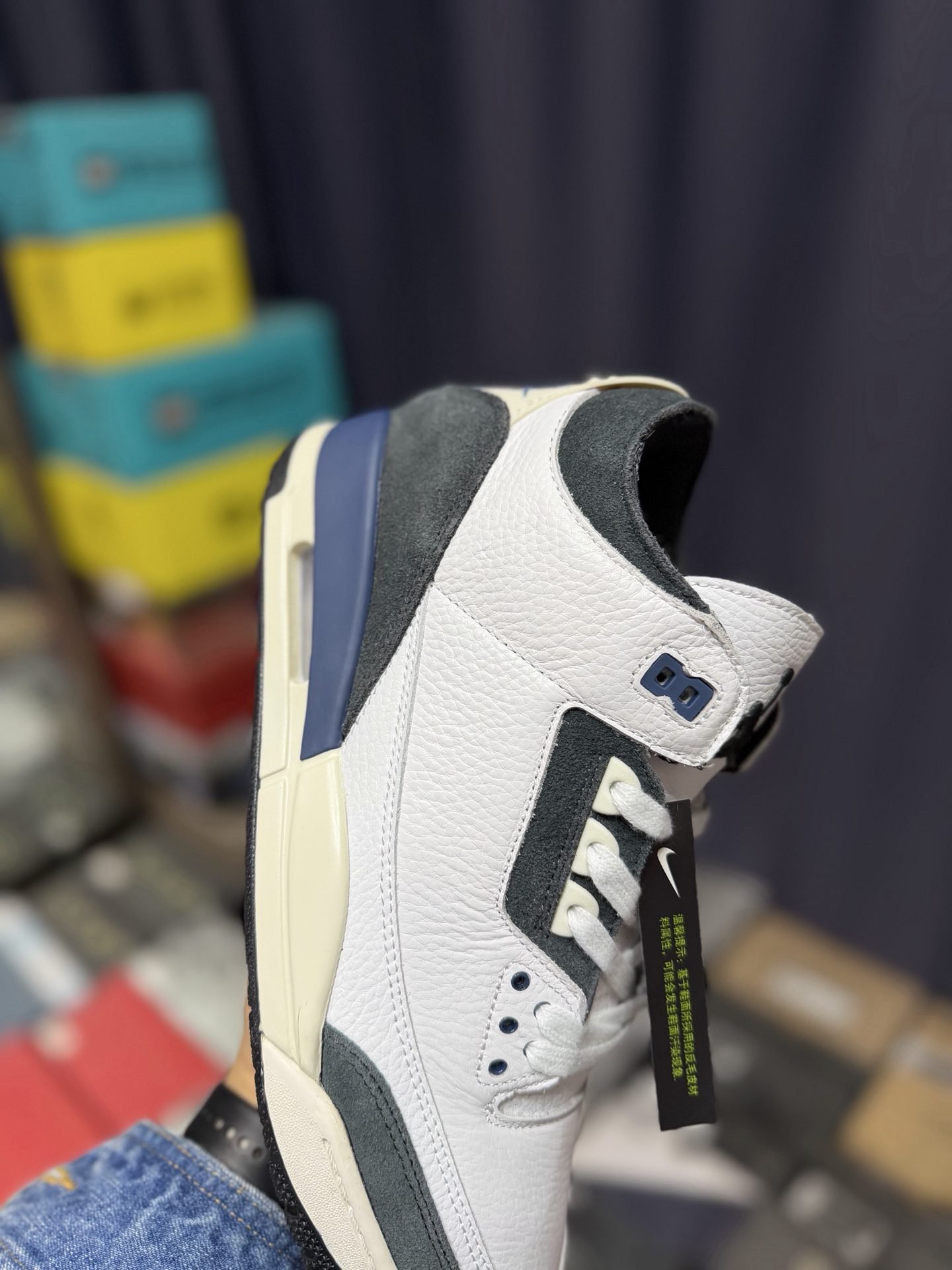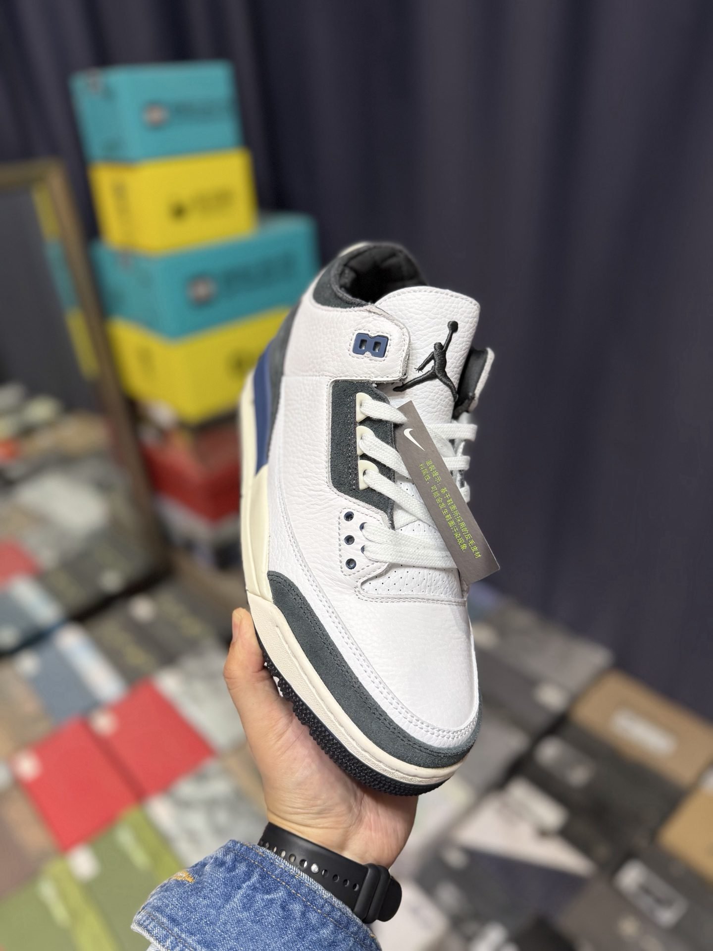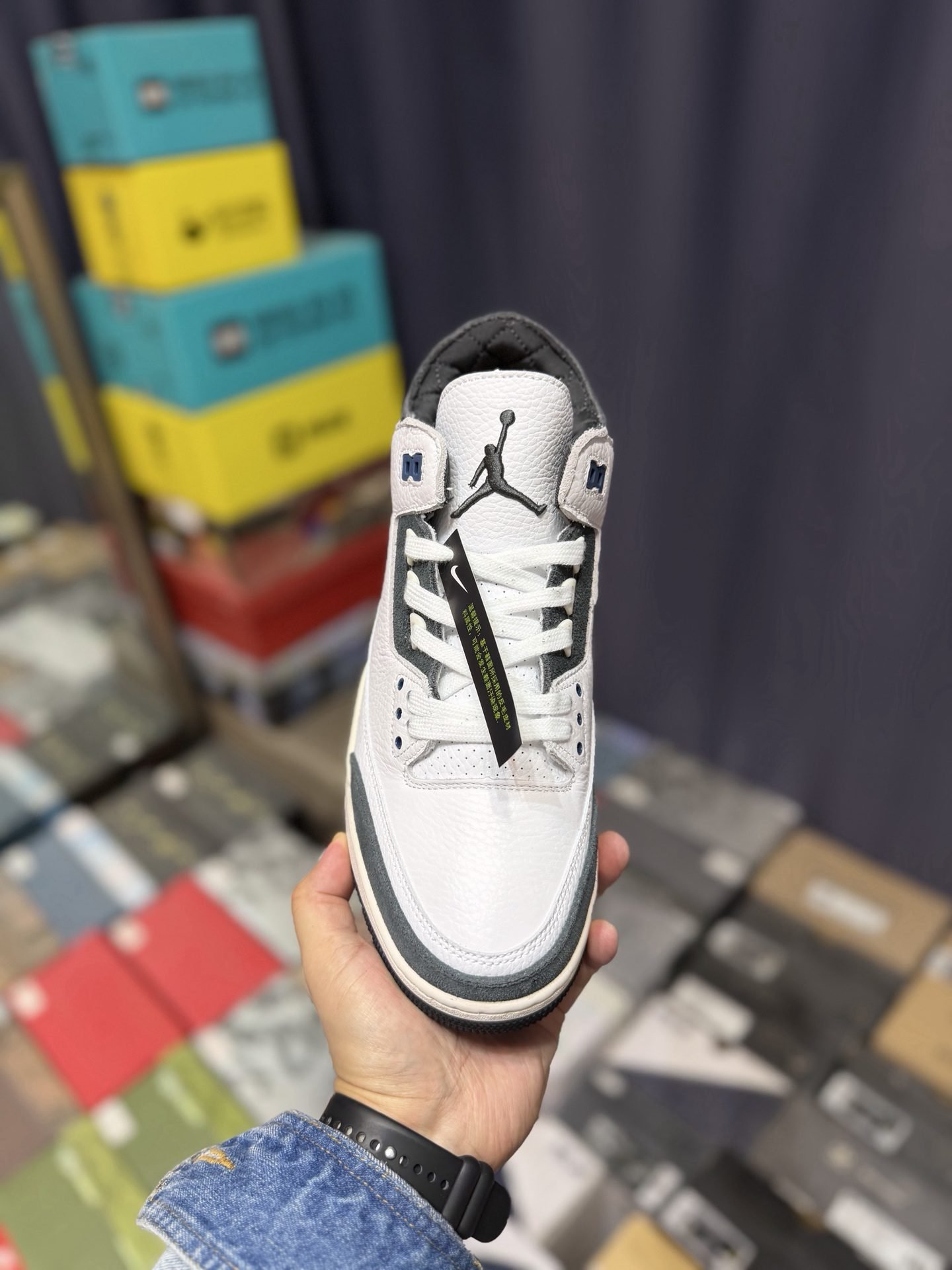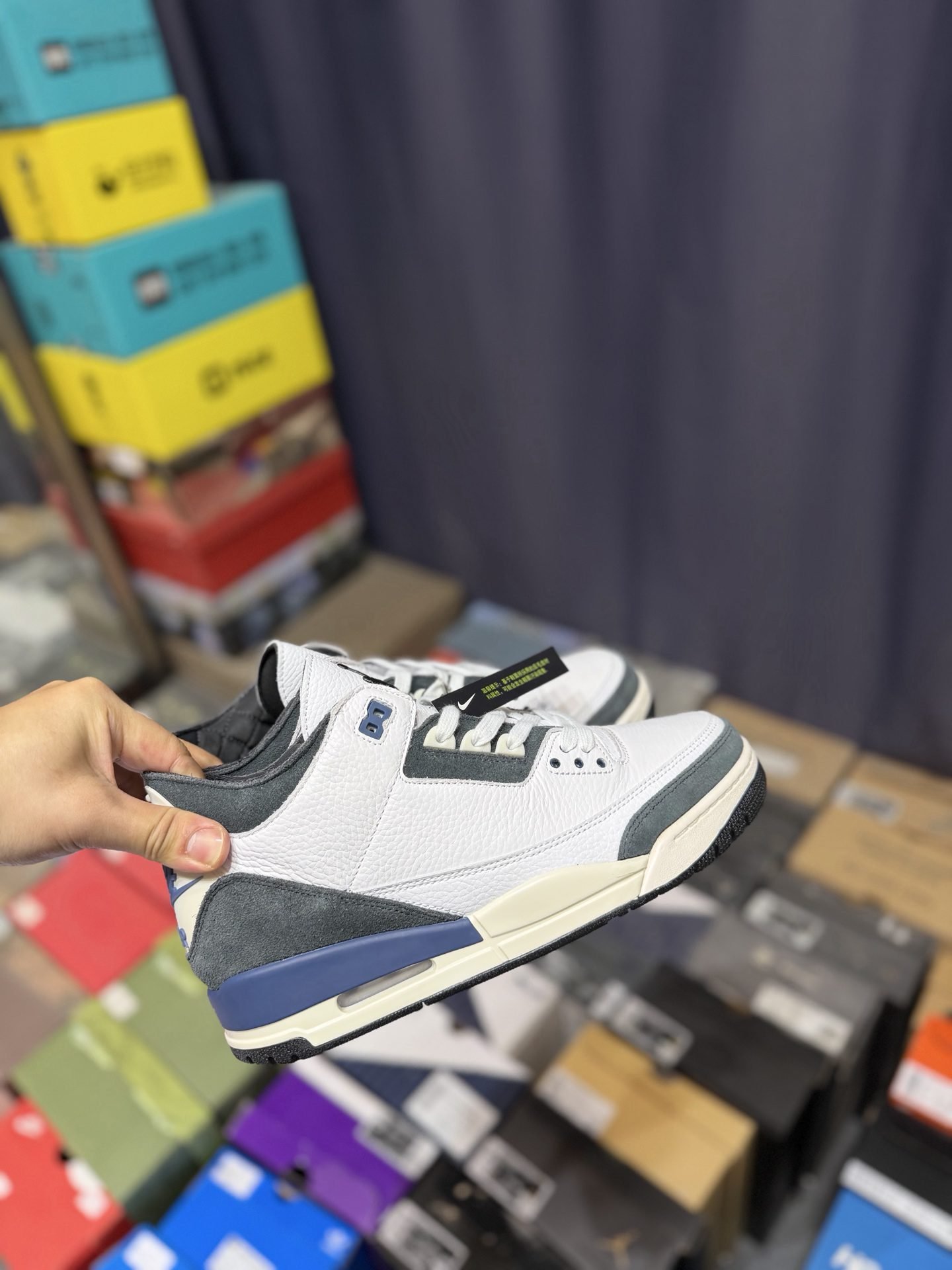 This Nike Air Jordan 3 sneaker features a refined combination of white, grey, and blue tones, showcasing the iconic silhouette’s premium leather construction and signature Air cushioning. Rooted in basketball heritage and elevated by modern design details, it blends retro charm with contemporary streetwear elegance. Perfect for sneaker enthusiasts and Jordan legacy admirers, this pair is a testament to the Air Jordan 3’s timeless appeal and Nike’s commitment to innovative athletic footwear.