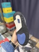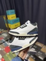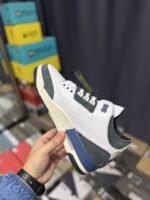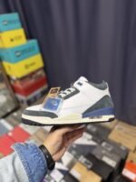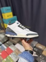 This Nike Air Jordan 3 sneaker features a refined combination of white, grey, and blue tones, showcasing the iconic silhouette’s premium leather construction and signature Air cushioning. Rooted in basketball heritage and elevated by modern design details, it blends retro charm with contemporary streetwear elegance. Perfect for sneaker enthusiasts and Jordan legacy admirers, this pair is a testament to the Air Jordan 3’s timeless appeal and Nike’s commitment to innovative athletic footwear.