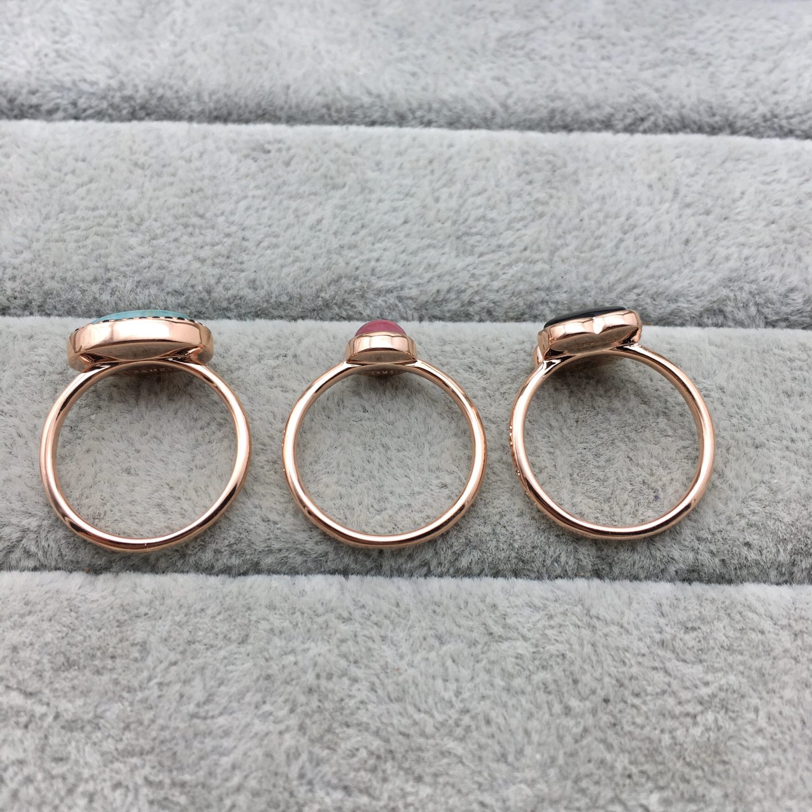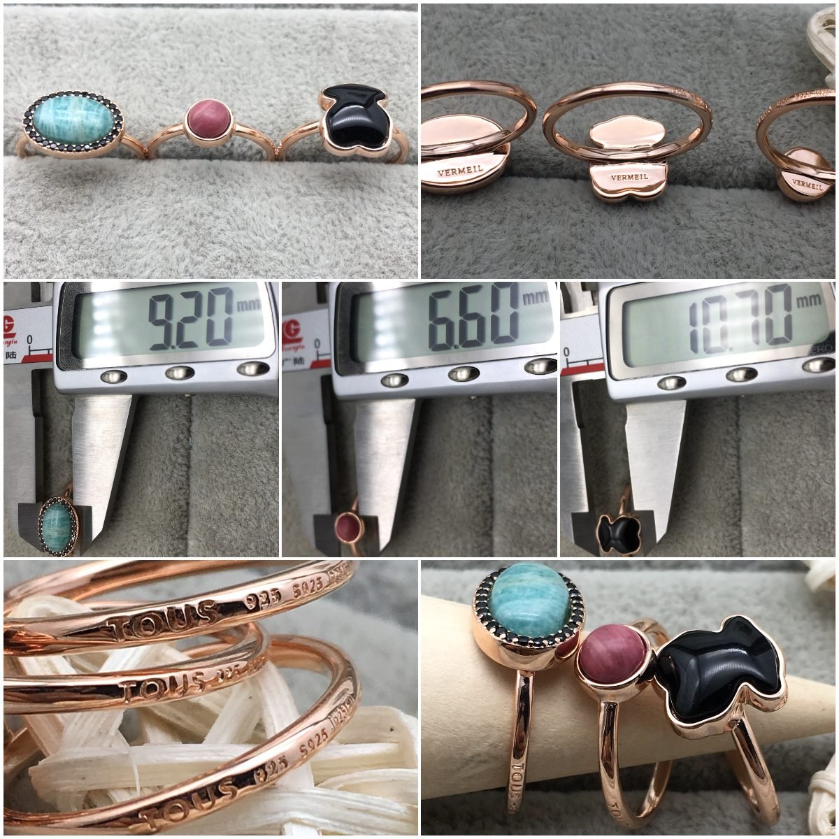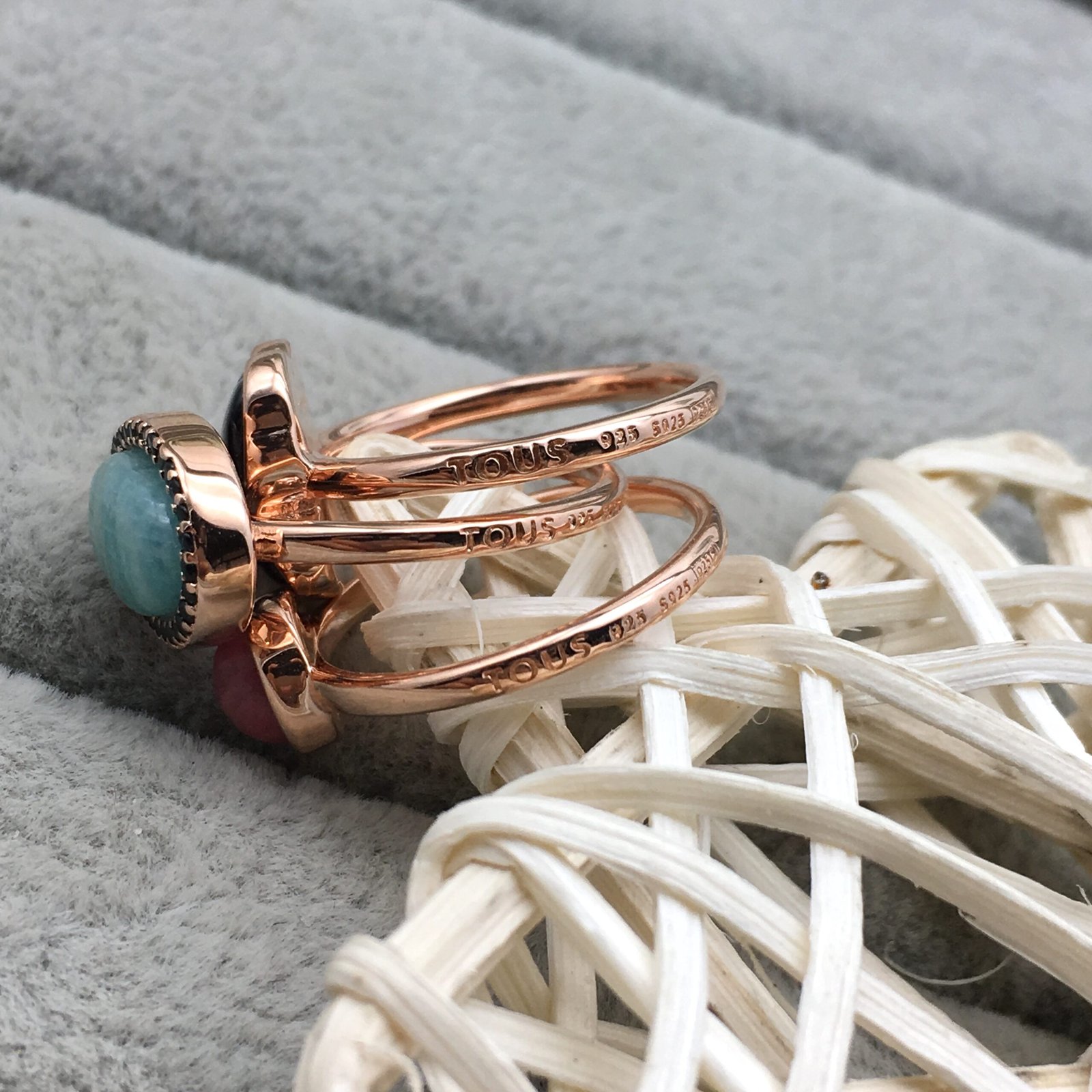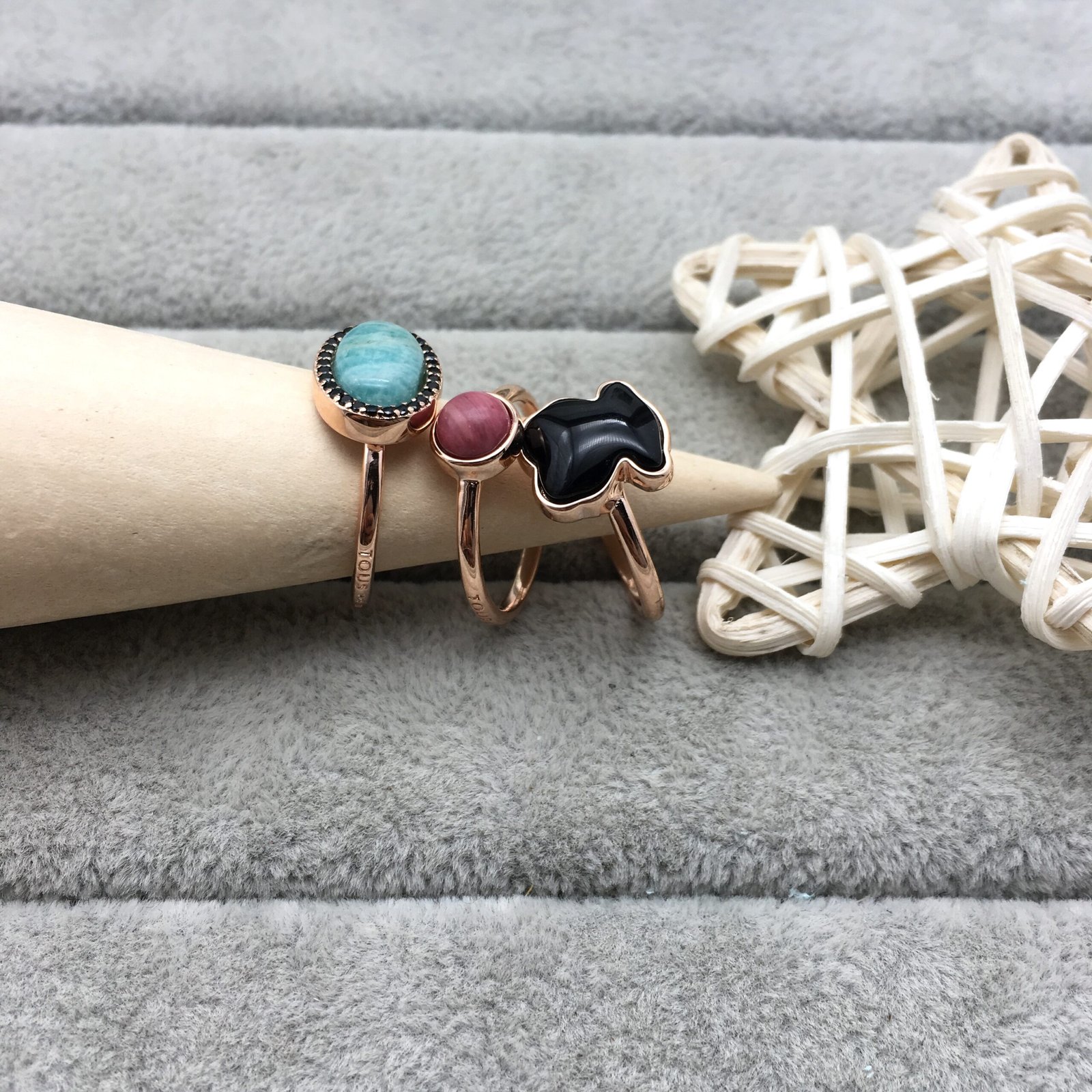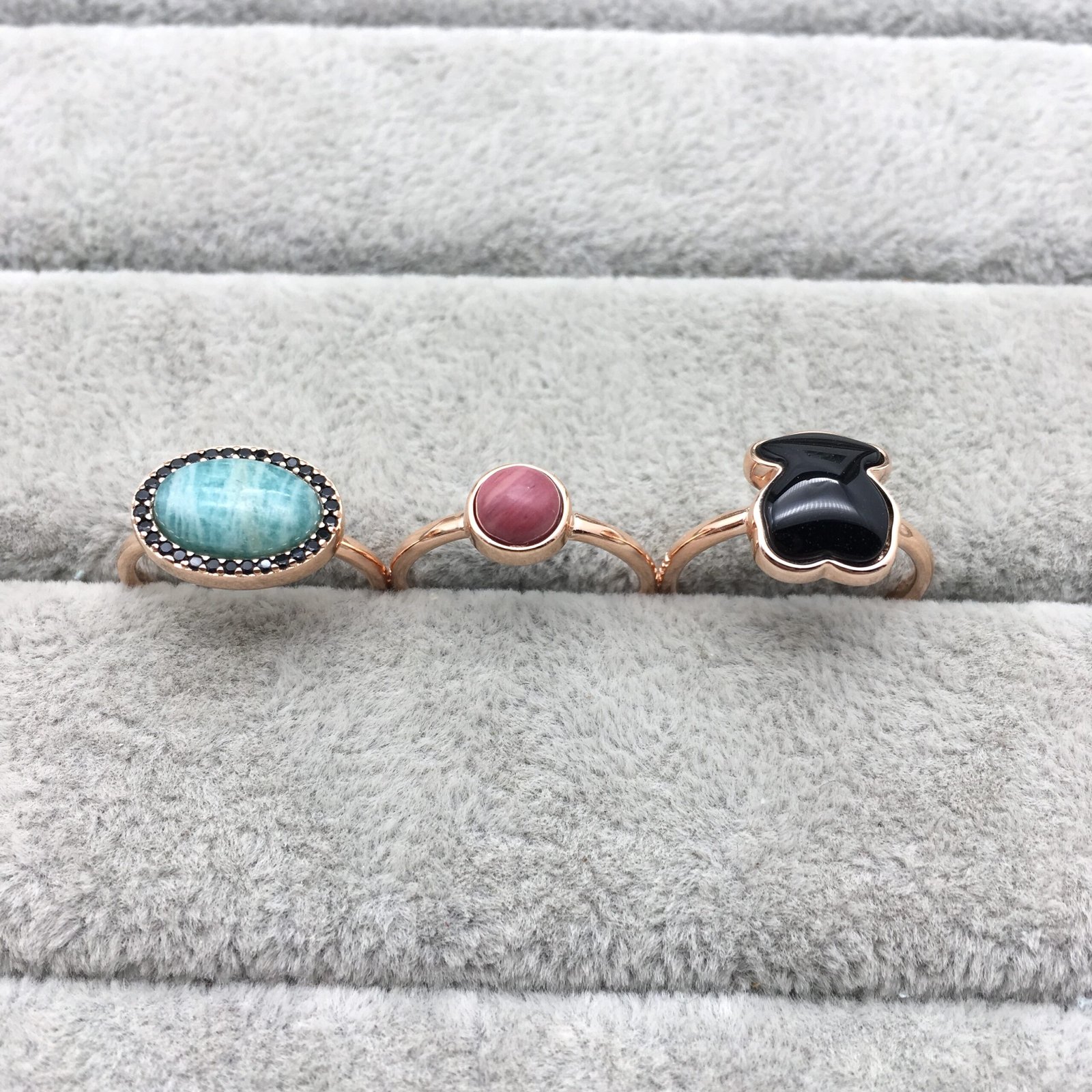 Pack of 3 TOUS Motif rings in rose vermeil silver with amazonite, spinel, rhodonite and onyx. Sizes: 0.67-1.1 cm. Vermeil: Sterling silver plated with a layer of 18kt rose gold.