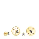 Pack of TOUS Magic Nature disc earrings in silver vermeil with two 1.2 mm rubies and two 1.2 mm iolites + star earrings with 5 mm mounted iolites and 4.7 mm bear earrings with 8×8 L/I set diamonds, with a total weight of 0.07 ct, all interchangeable at the center of the disc. Push back. Sterling silver plated with 18kt gold with a thickness of 3 to 5 microns and with no other metal between them. Production technique: Casting.