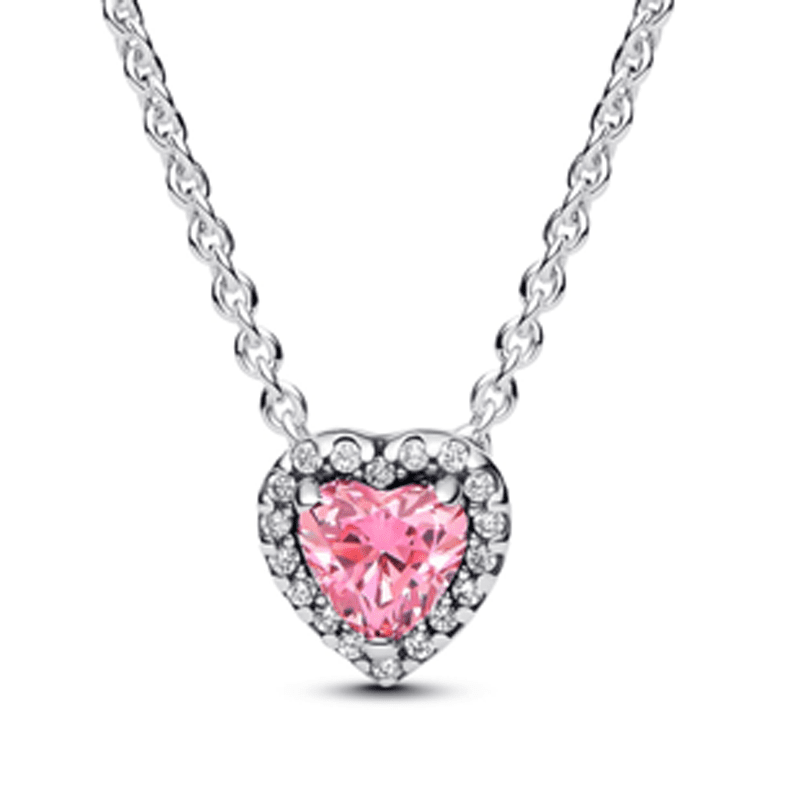 This Pandora necklace is crafted from signature 925 sterling silver, featuring a heart-cut pink cubic zirconia at its center, surrounded by a halo of clear, sparkling stones that create a starlight effect, giving the piece a romantic, luminous glow.