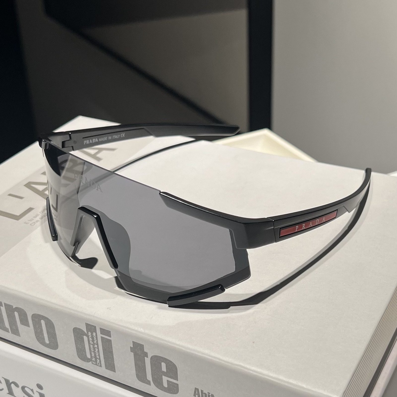 Home SUNGLASSES Sunglasses-PRADA PRADA Black Edge and Dark Gray Reflective Lens Unique Goggles Sunglasses