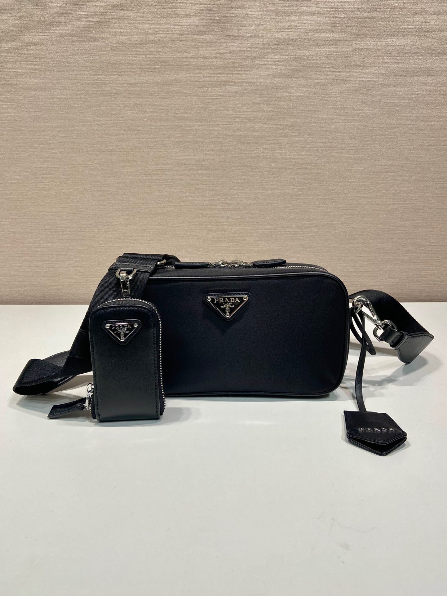 With simple lines, this modern bag comes with a removable braided long strap ???? with a removable pouch and leather tag. ???? made of imported nylon and calfskin, this bag is classic and modern ???????? measuring 22x 12x 7.5cm at bottom