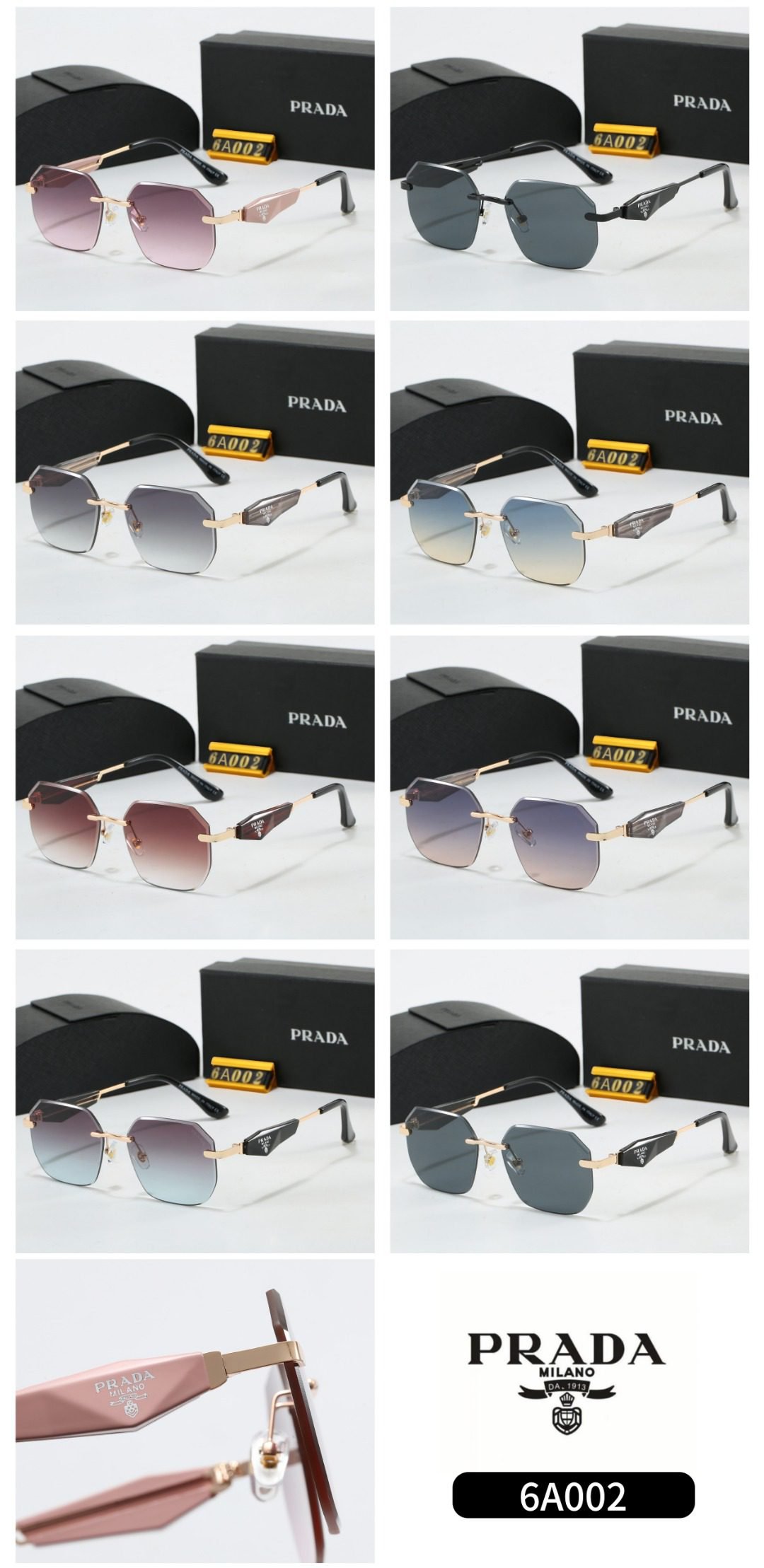 Elevate your accessory collection with Prada’s octagonal sunglasses (Model 6A002). Featuring chic octagonal frames, they come in a range of elegant gradient options—from pink – hued gradient lenses with gold – accented frames, sleek dark lenses with black frames, gray gradient lenses with gold – accented frames, to light blue gradient lenses, rich brown gradient lenses, purple gradient lenses, and more.