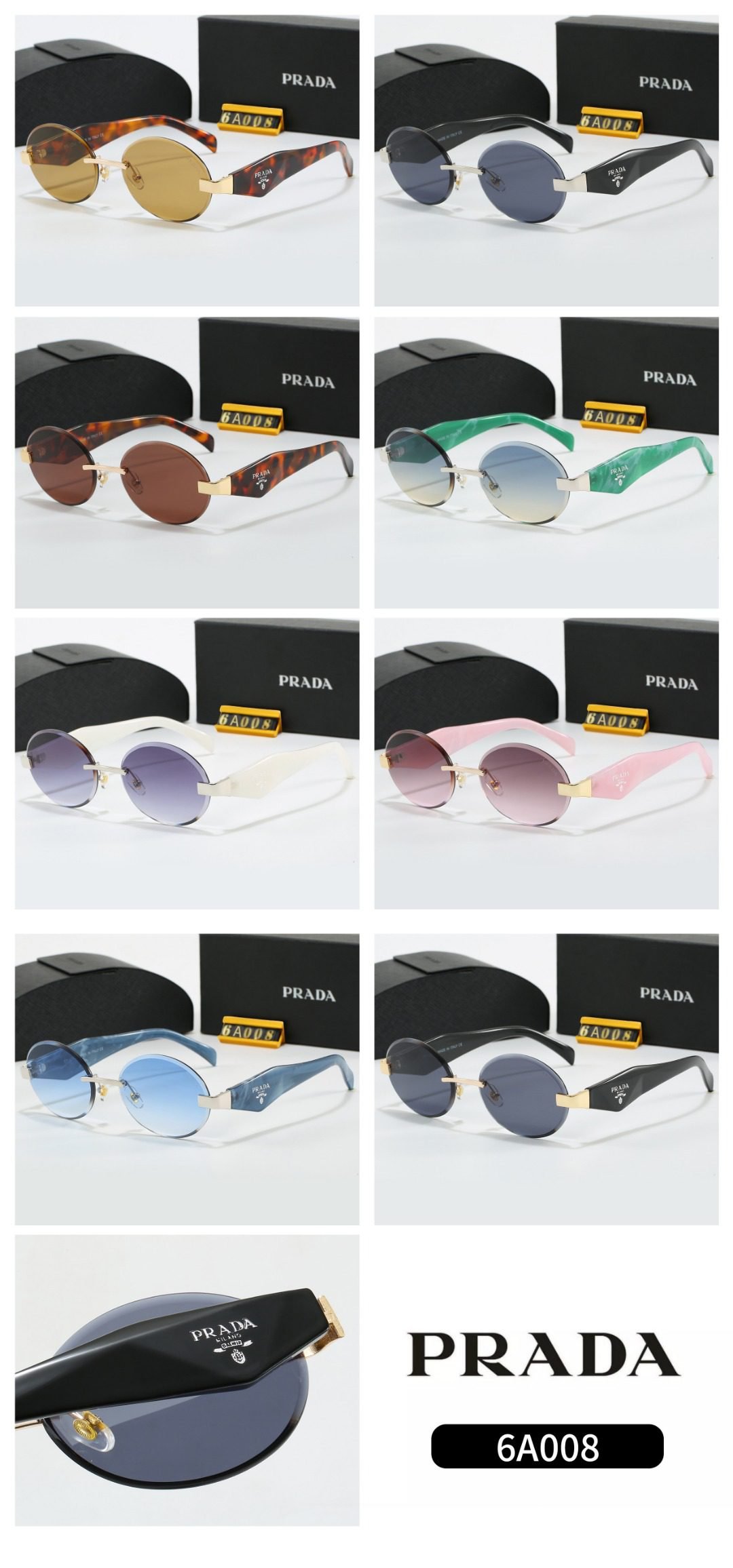 Elevate your accessory collection with Prada’s round sunglasses (Model 6A008). Featuring chic round frames, they come in a range of colorful options—from tortoiseshell – patterned frames with warm yellow lenses, sleek black frames with blue lenses, tortoiseshell – patterned frames with rich brown lenses, green frames with light blue gradient lenses, to white frames with purple gradient lenses, pink frames with purple gradient lenses, blue frames with light blue gradient lenses, and more.