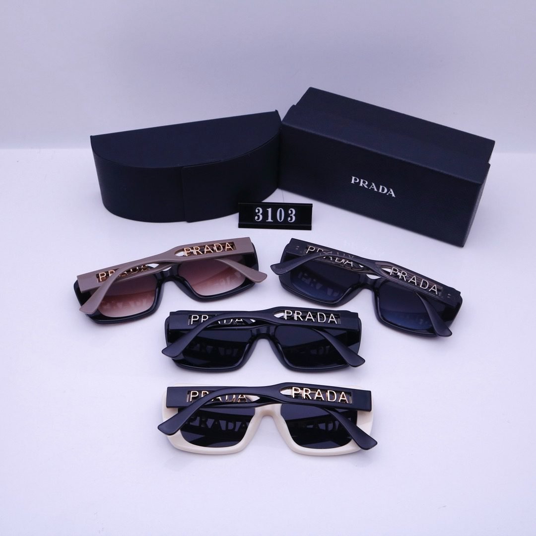Elevate your accessory collection with Prada’s square sunglasses (Model 3103). Featuring stylish square frames, they come in a range of elegant options—from gradient brown and sleek dark gray lenses to a chic white – framed style, all showcasing the iconic Prada branding on the lenses.