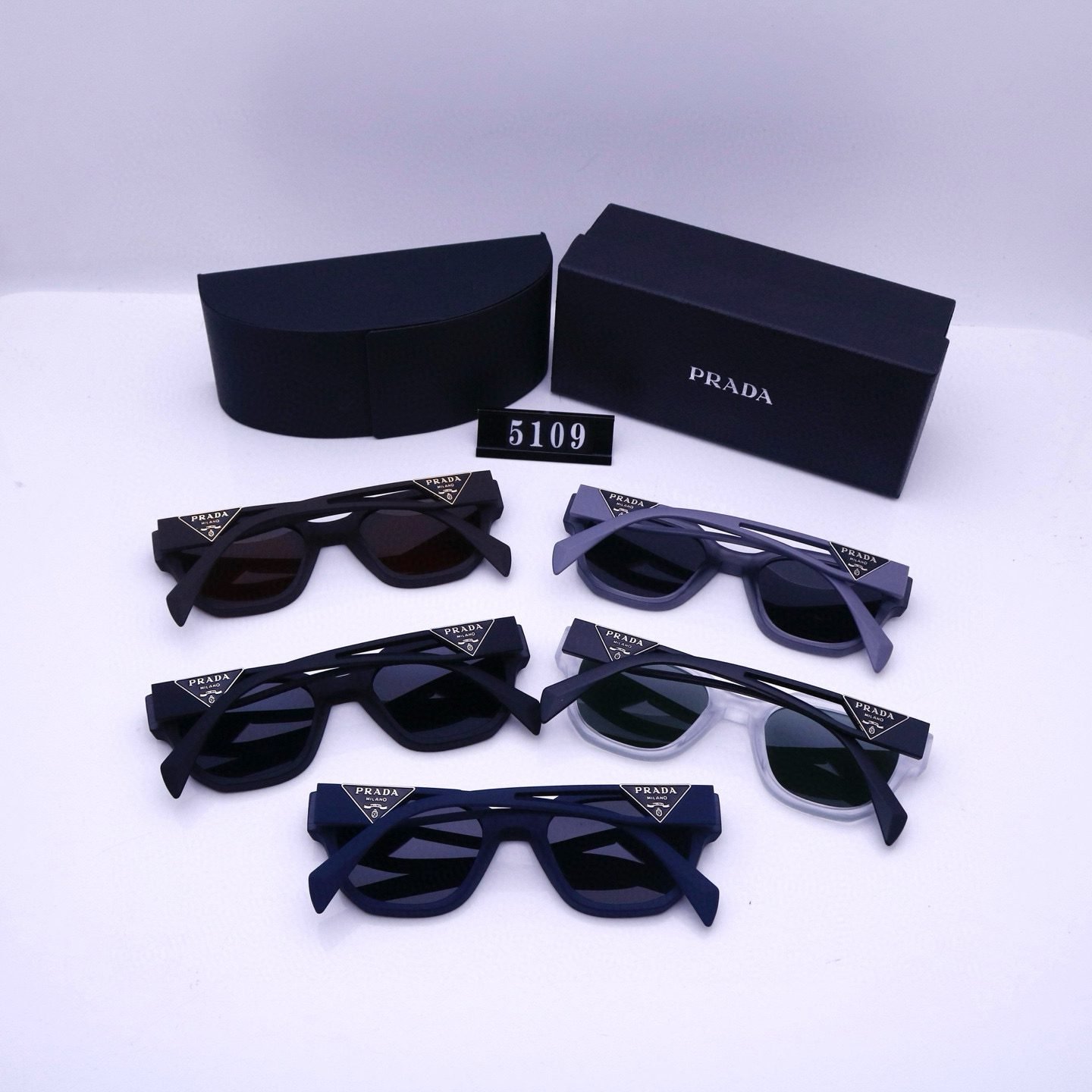 Elevate your accessory collection with Prada’s square sunglasses (Model 5109). Featuring stylish square frames, they come in a range of versatile hues—from brown frames with warm brown lenses, sleek black frames with dark lenses, deep navy frames with dark lenses, gray frames with dark lenses, to a translucent frame with gradient green lenses.