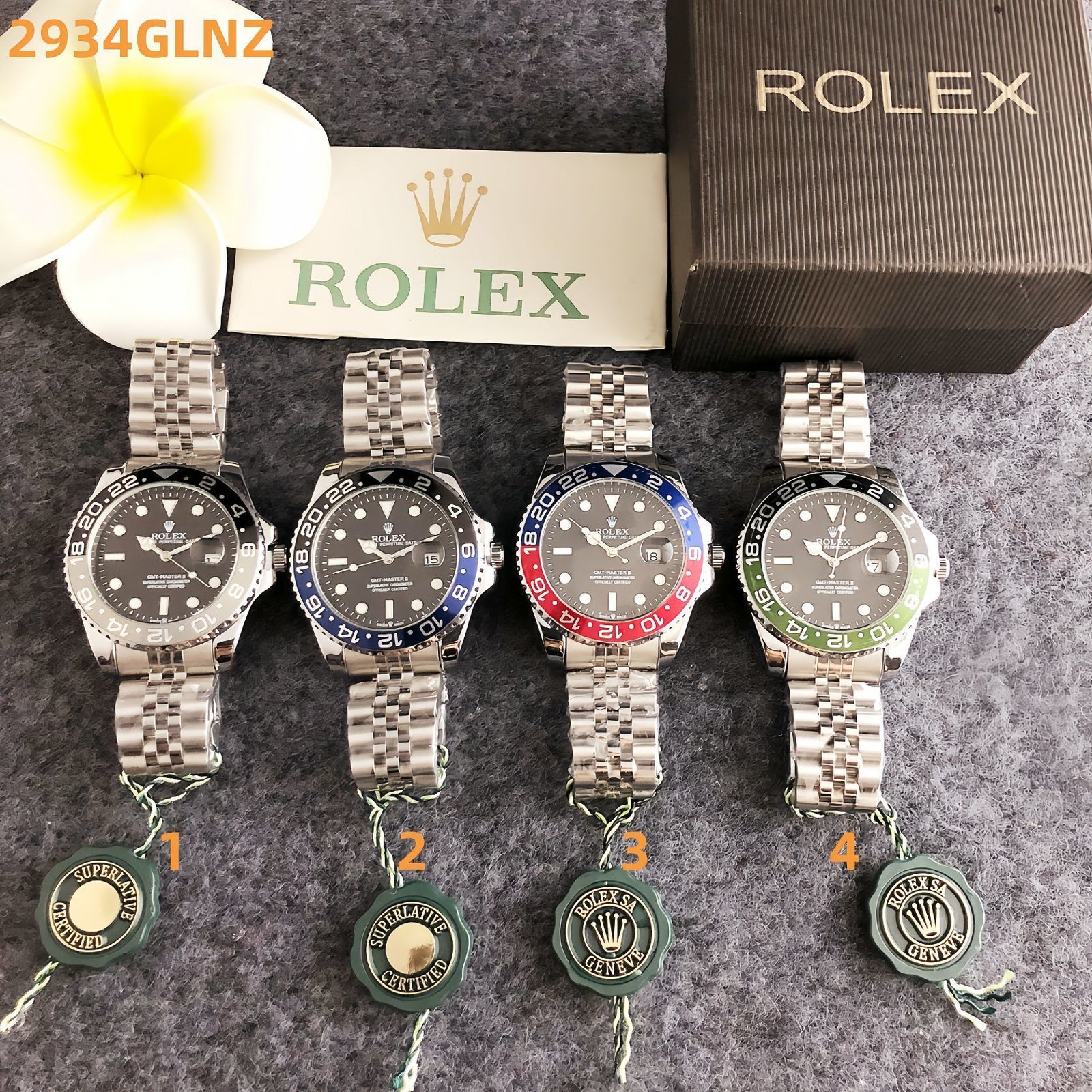 Rolex 2934GLNZ series watches epitomize the brand’s renowned GMT-Master heritage, featuring distinctive circular dials with dual-time functionality, vibrant multi-colored bezels (black, blue, red-blue, green), and the iconic Jubilee metal bracelet. With Rolex’s signature attention to detail and legacy of horological precision, these timepieces exude sophisticated versatility. Perfect for globetrotters and style enthusiasts alike, they make a refined statement suitable for both international travel and everyday urban elegance.
