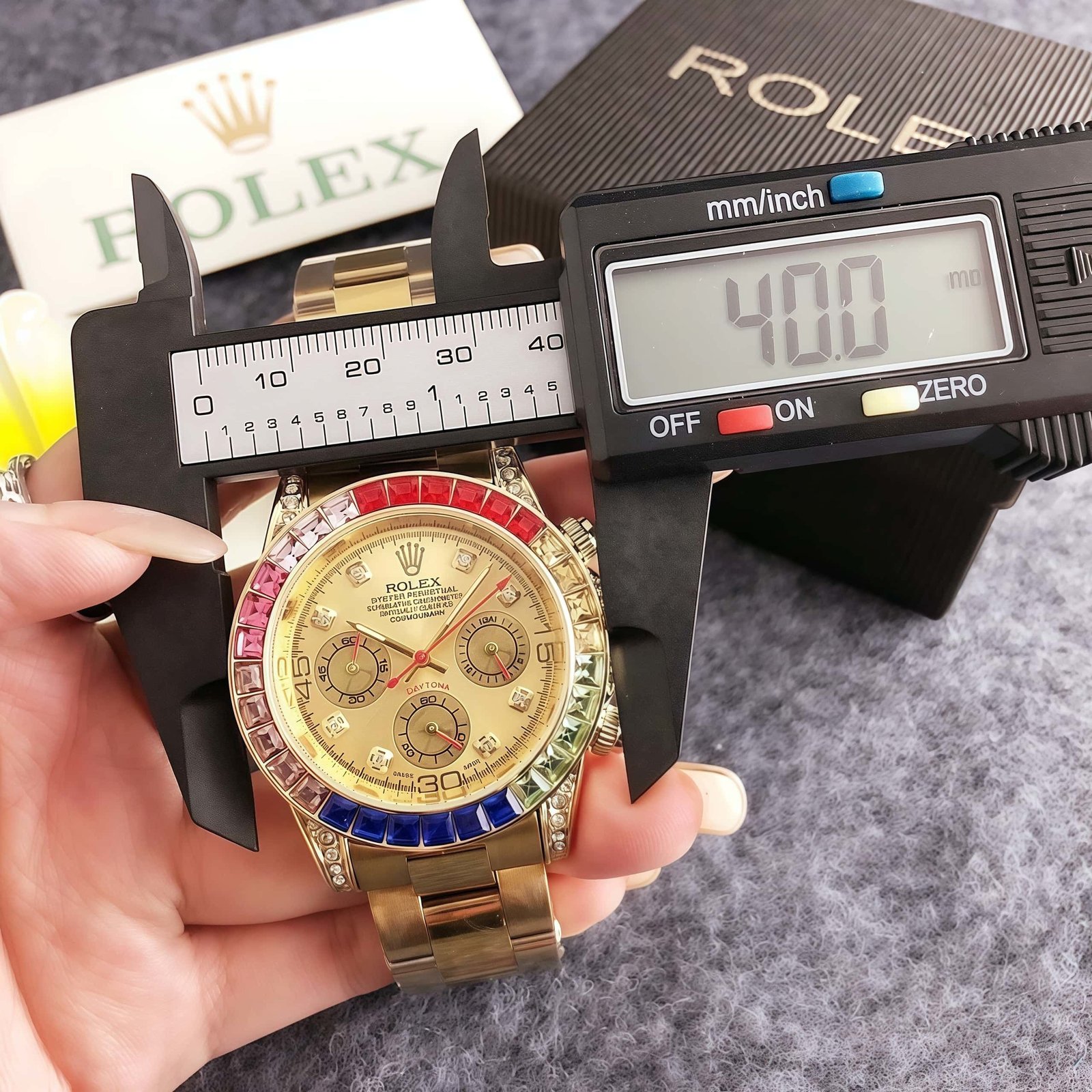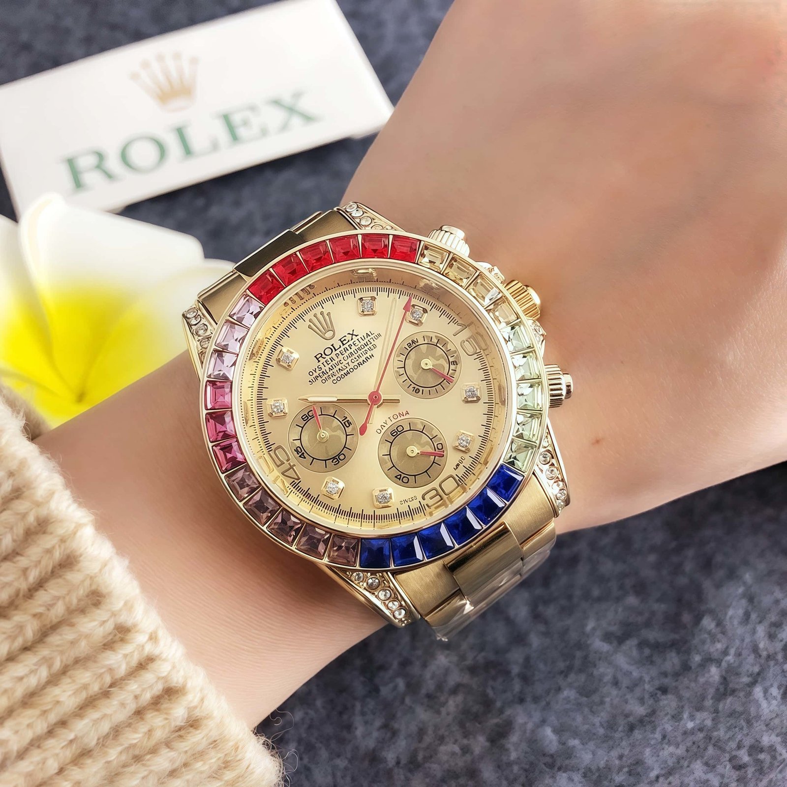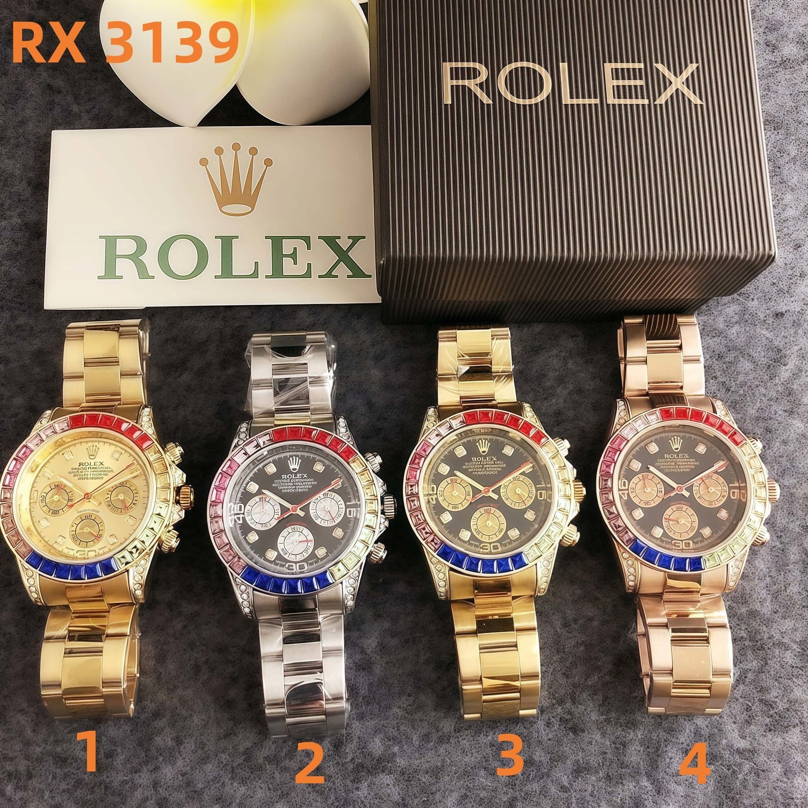 Rolex RX 3139 series watches showcase exquisite craftsmanship and eye – catching design. Featuring vibrant gem – set bezels in colors like red, blue, and more, paired with elegant metal bracelets in tones such as gold, silver, and rose gold, these timepieces blend luxury and bold style seamlessly. Perfect for making a statement, they embody Rolex’s legendary precision and high – end fashion.