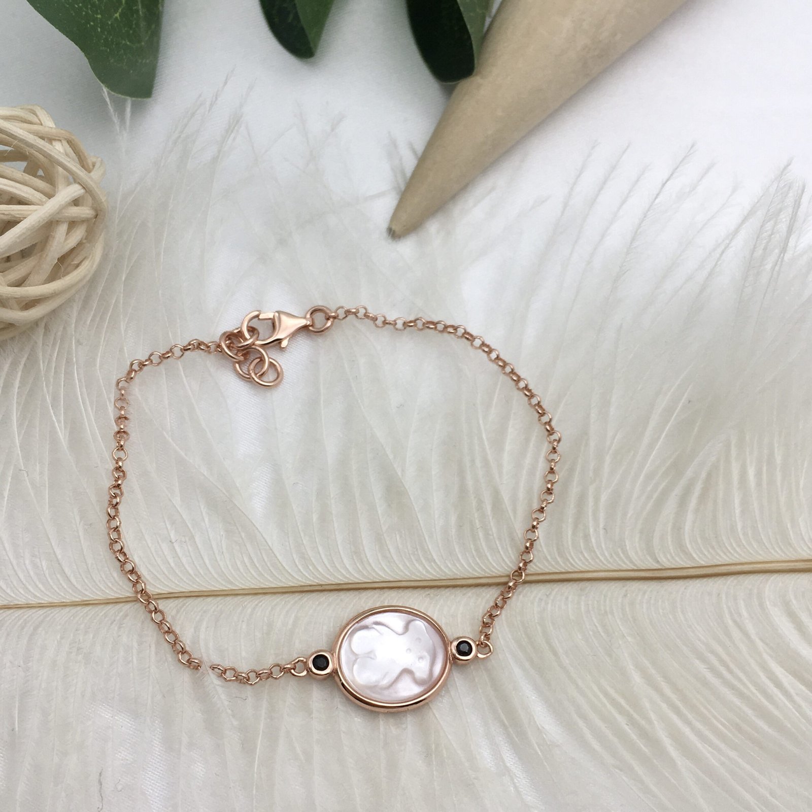 Rose Vermeil Silver Camee Bracelet with Mother-of-Pearl and Spinel