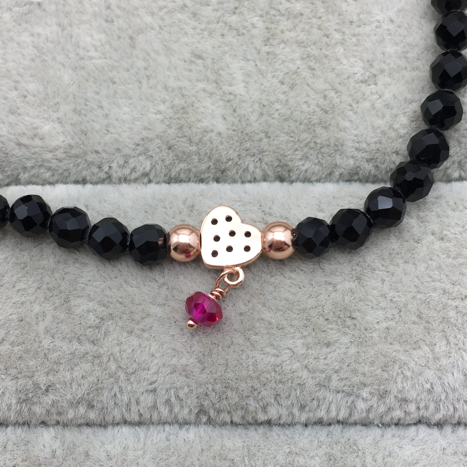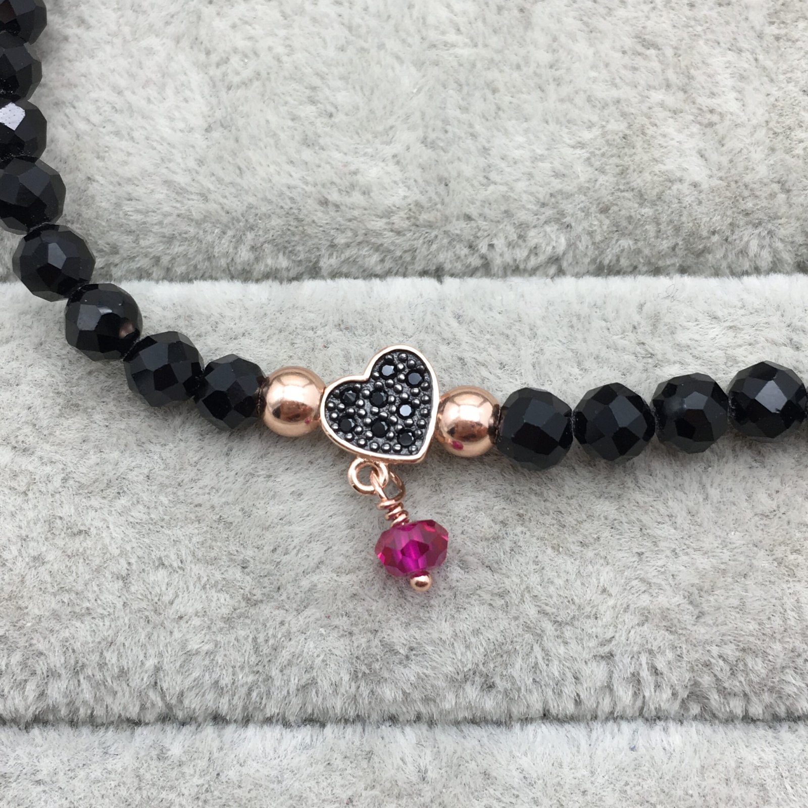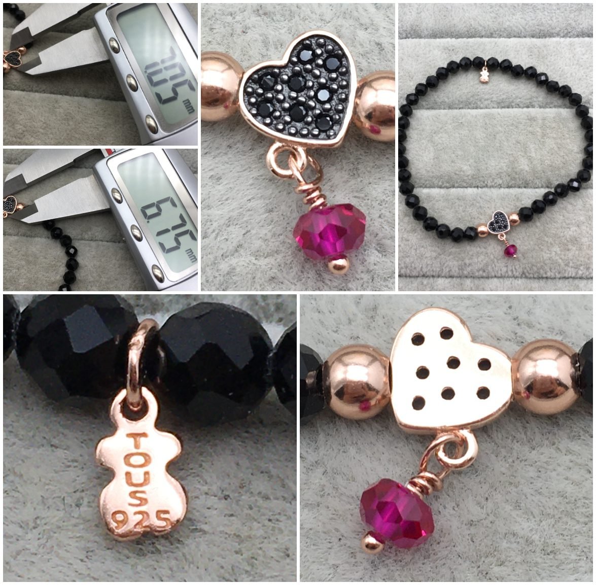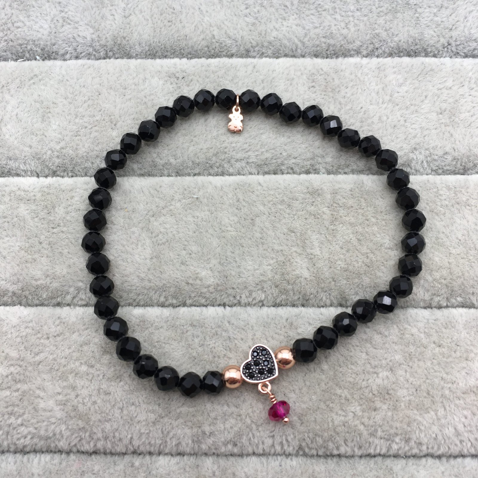Be the first to review “Rose Vermeil Silver TOUS Motif Bracelet with spinels and faceted onyx. Heart motif” Cancel reply