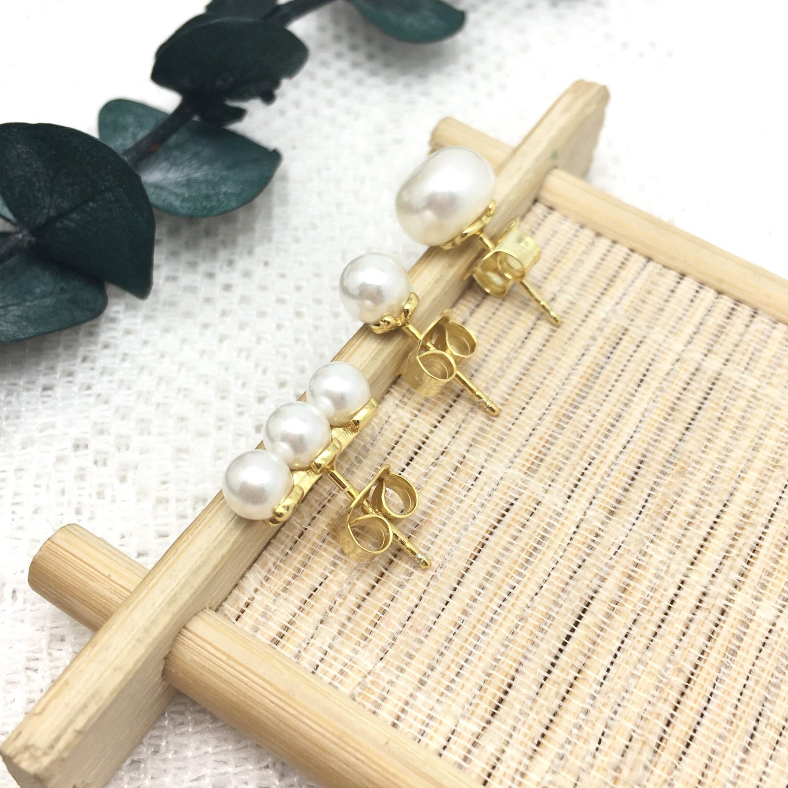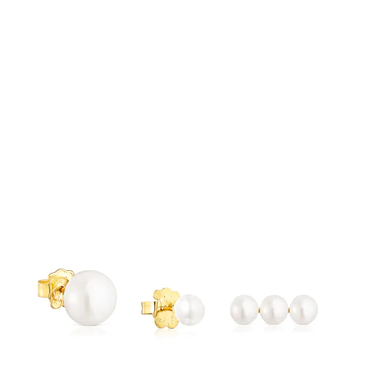 Set of three TOUS Gloss earrings in silver vermeil with cultured freshwater pearls; 4.5-6 mm round and 9-9.5 mm half-round. Push back.