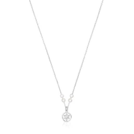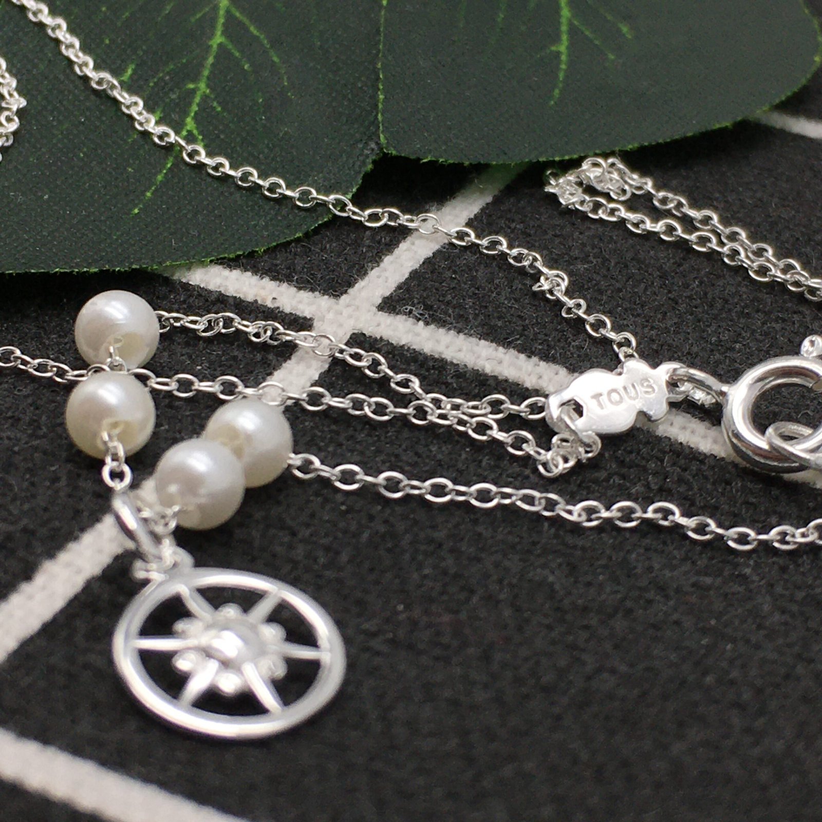 TOUS Magic Nature set in sterling silver comprising a necklace four 4 mm round cultured freshwater pearls and a sun pendant measuring 9 mm. Necklace length: 45 cm, with 40 cm ring + Long earrings with three 3.5 mm round cultured freshwater pearls, a 9 mm sun and a 6 mm star. Push back. Chain length: 45 cm. Production technique: Casting