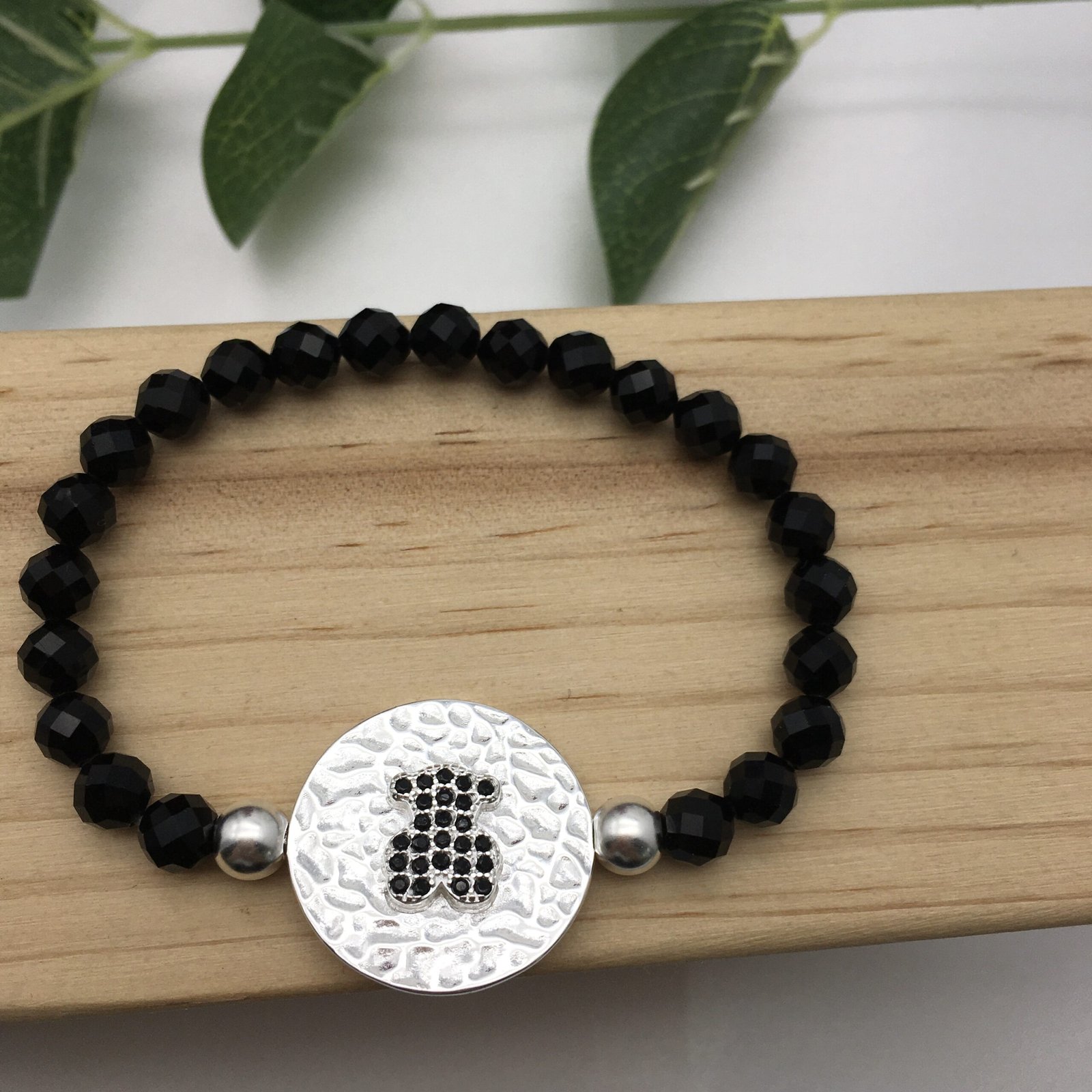 Sterling silver TOUS Rupp Bear bracelet with faceted onyx balls and spinel. Motif: 2,3cm. Long: 16cm.