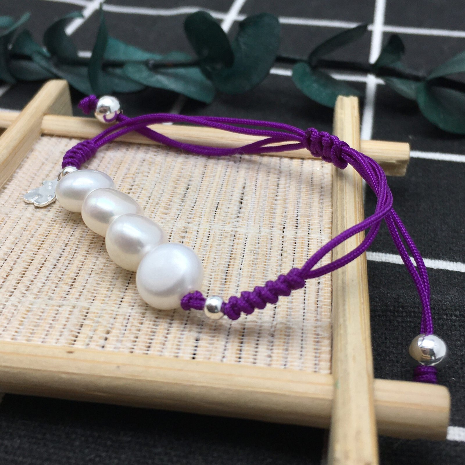 If you love dressing in the more classic colors, try this cultivated pearl bracelet combined with purple nylon. Didn’t you hear that this color is the new black? Be bold.