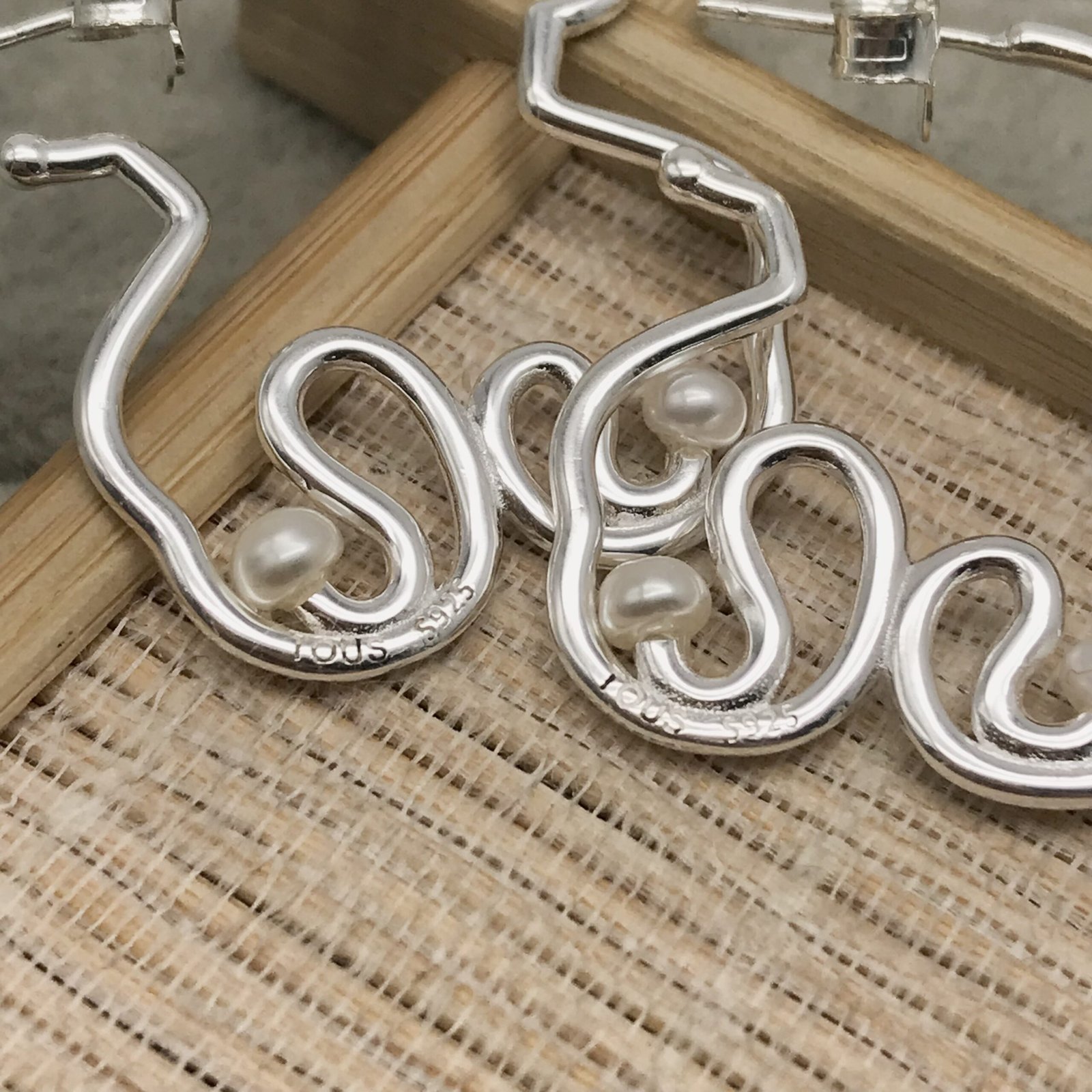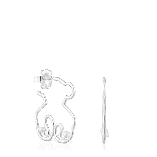 TOUS Tsuri bear earrings in sterling silver with cultured pearls on the bear silhouette. Size of pearls: 4-4.5 mm. Size of bear: 30 mm. Push back.