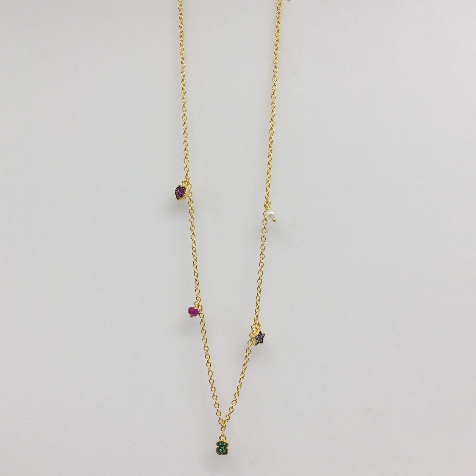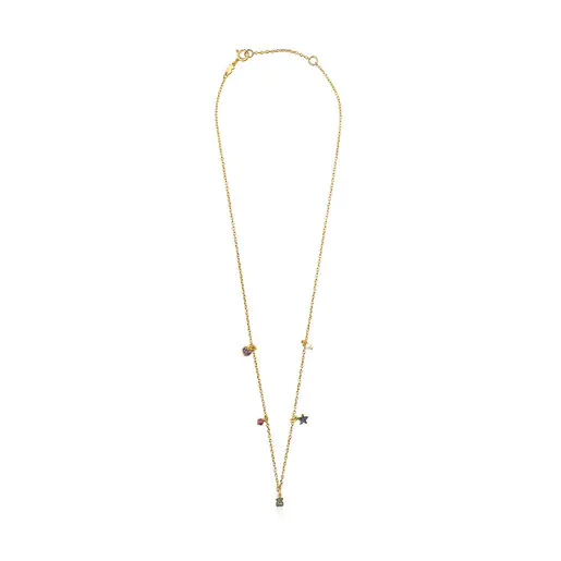 TOUS New Motif necklace in silver vermeil with an amethyst heart motif, a blue sapphire star motif and a chrome diopside bear motif, as well as a pearl and treated ruby detail. Distance between the motifs: 35 mm. Total necklace length: 45 cm.