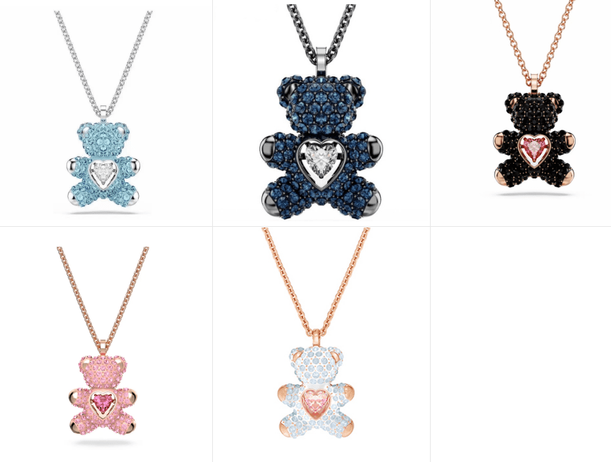The Swarovski Teddy Bear Heart Necklace Collection features adorable teddy bear pendants encrusted with vibrant Swarovski crystals, each with a heart-shaped accent at the center. Available in a range of charming hues like light blue, navy, black, pink, and white, these necklaces blend playful design with luxurious sparkle. Perfect for those who love cute yet sophisticated jewelry, this collection is ideal for adding a touch of whimsy and glamour to any outfit, whether for daily wear or special occasions.