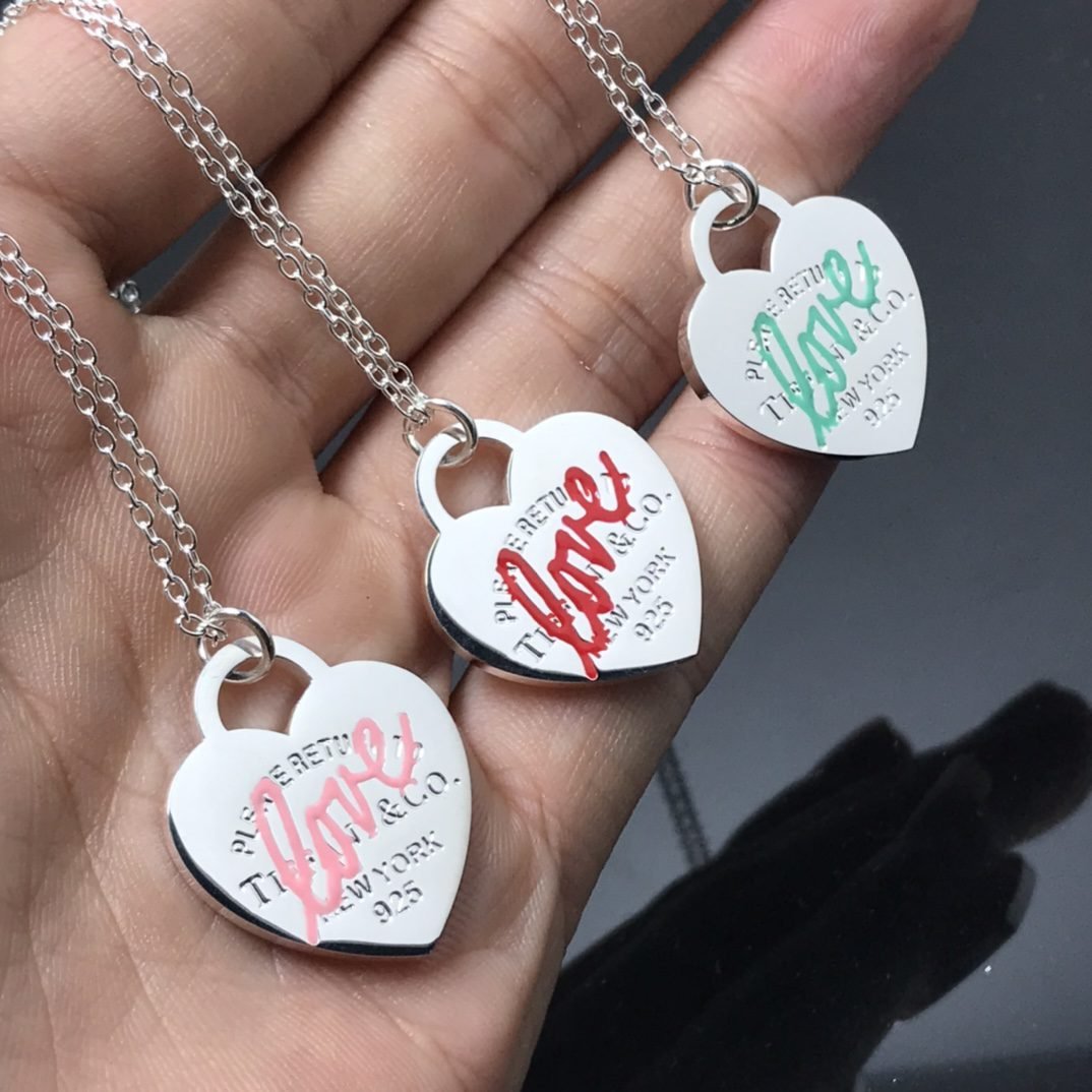 Home JEWELRY TIFFANY TIFFANY NECKLACE Tiffany Love Collection Color-Printed Heart Lock Pendant Necklace – 925 Silver Multi-Color Collarbone Chain, Tiffany Romantic Logo Necklace