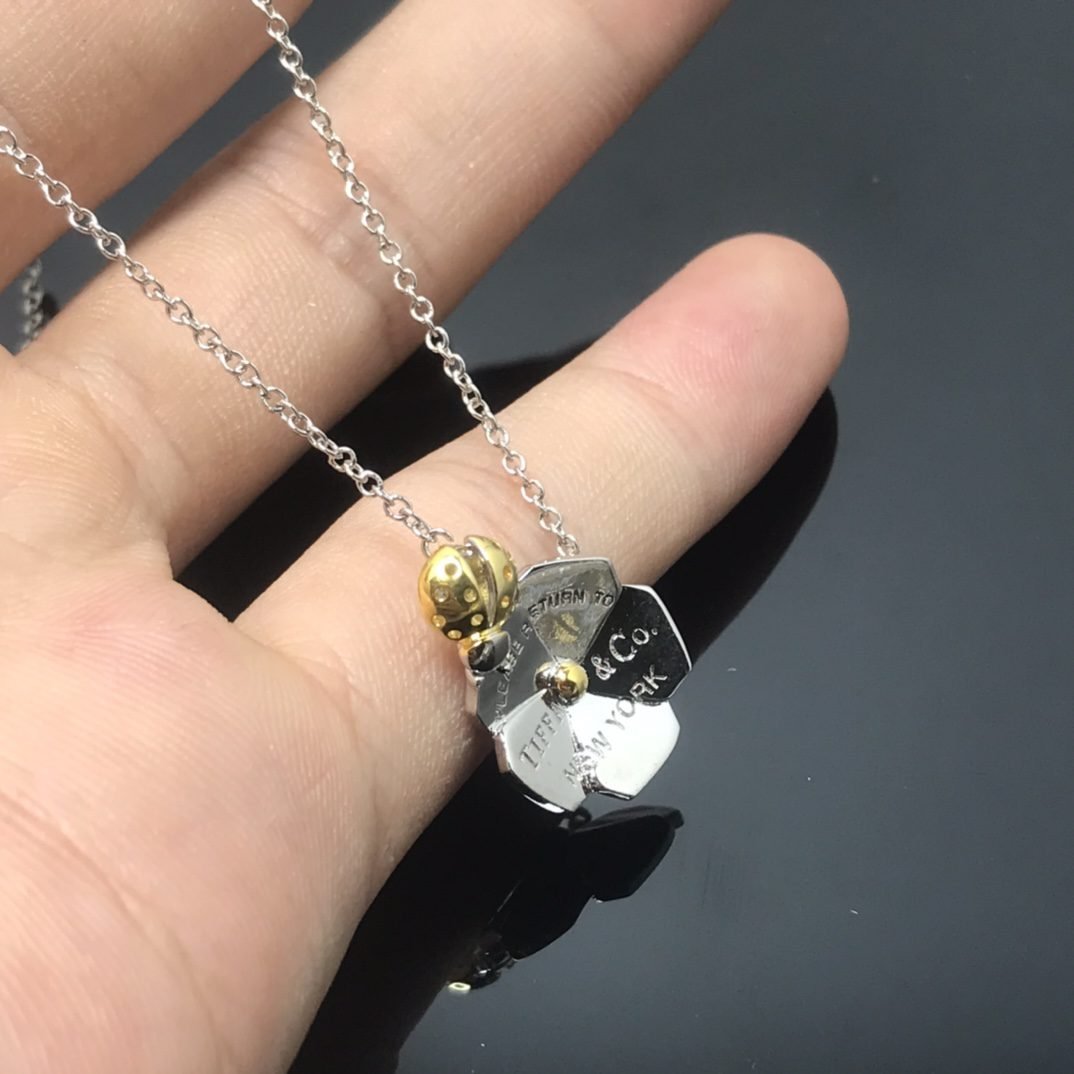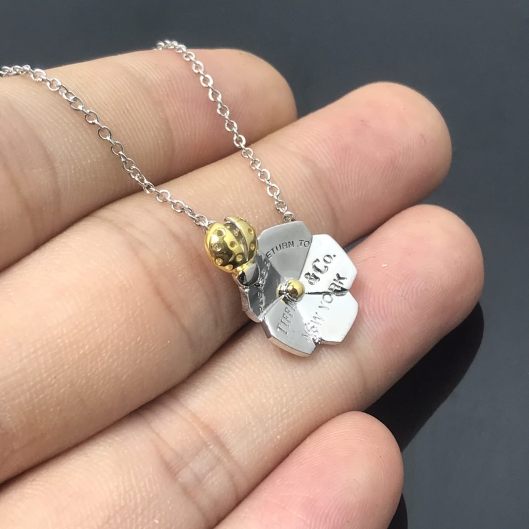 Tiffany Return to Tiffany Collection Ladybug & Four-Petal Flower Pendant Necklace – 925 Silver + 18K Gold Color-Block Necklace, Tiffany Classic Logo Collarbone Chain