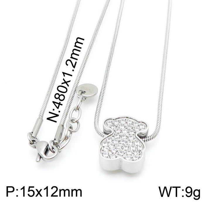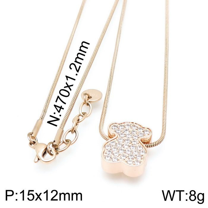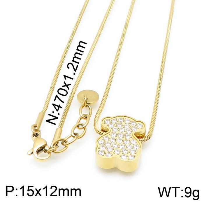 Welcome to explore this new 2024 stainless steel gemstone inlaid teddy bear necklace pendant. This pendant has become the focus of attention in the fashion industry due to its unique design, high-quality materials, and exquisite craftsmanship. The pendant is made of high-quality stainless steel material, which not only has excellent corrosion resistance and wear resistance, but also ensures lightweight and comfortable wearing. Stainless steel has a unique texture, long-lasting luster, and can maintain its new appearance for a long time. The exquisite inlay technique perfectly combines the gemstones with the bear shape, resulting in bright colors and sparkling radiance. The design of Little Bear has smooth lines and a cute image, making it extremely valuable as a decoration or collectible. The design inspiration for the pendant comes from the cute image of the teddy bear, integrating modern aesthetics and fashion elements to create unique jewelry accessories. The features and limbs of the teddy bear are carefully designed and lifelike, showcasing its liveliness and agility. The overall shape of the pendant is a teddy bear, delicate and compact, making it easy to wear. This pendant is suitable for wearing in various occasions, whether it is for daily wear or attending important events, it can become a highlight for the wearer. At the same time, it is also a beautiful gift, suitable for giving to family and friends, expressing feelings and blessings. The length of this necklace is 48cm, and the pendant is 15x12mm.