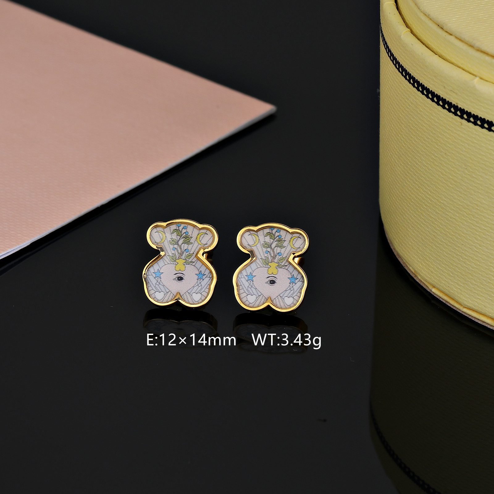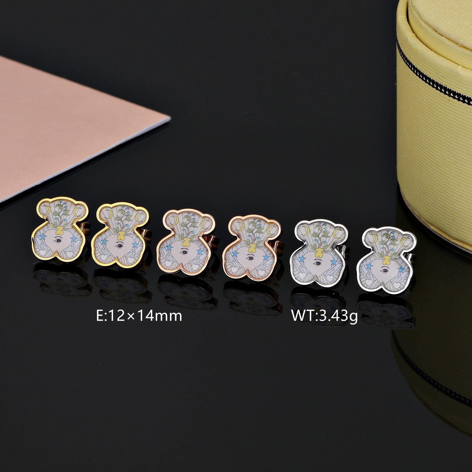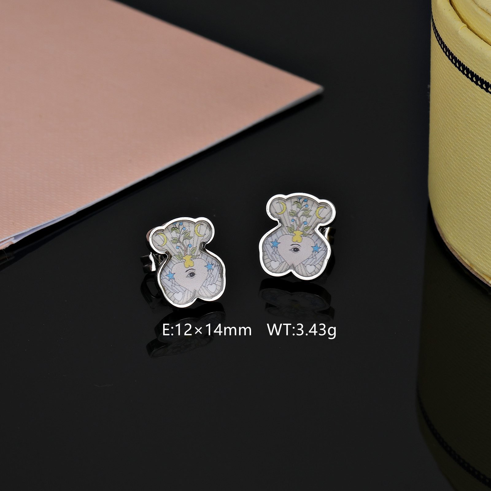 Colorful element embellishment: In addition to the heart-shaped eye pattern, the earrings also cleverly incorporate colorful elements. These colors may be presented in the form of inlaid gemstones, painted patterns, or metal oxide coloring, adding a bright touch of color to the bear and heart-shaped eyes, making the entire earring more vivid, interesting, and full of vitality.