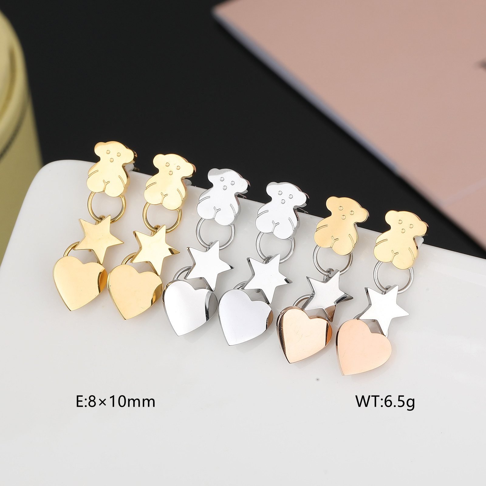 Vertical arrangement, clear hierarchy: The earrings adopt a vertical arrangement design, with the Spanish bear, star, and heart arranged from top to bottom, with clear hierarchy and visual effect. This arrangement not only breaks the traditional flat layout of earrings, but also adds a three-dimensional and dynamic feeling, making it unforgettable at first glance.