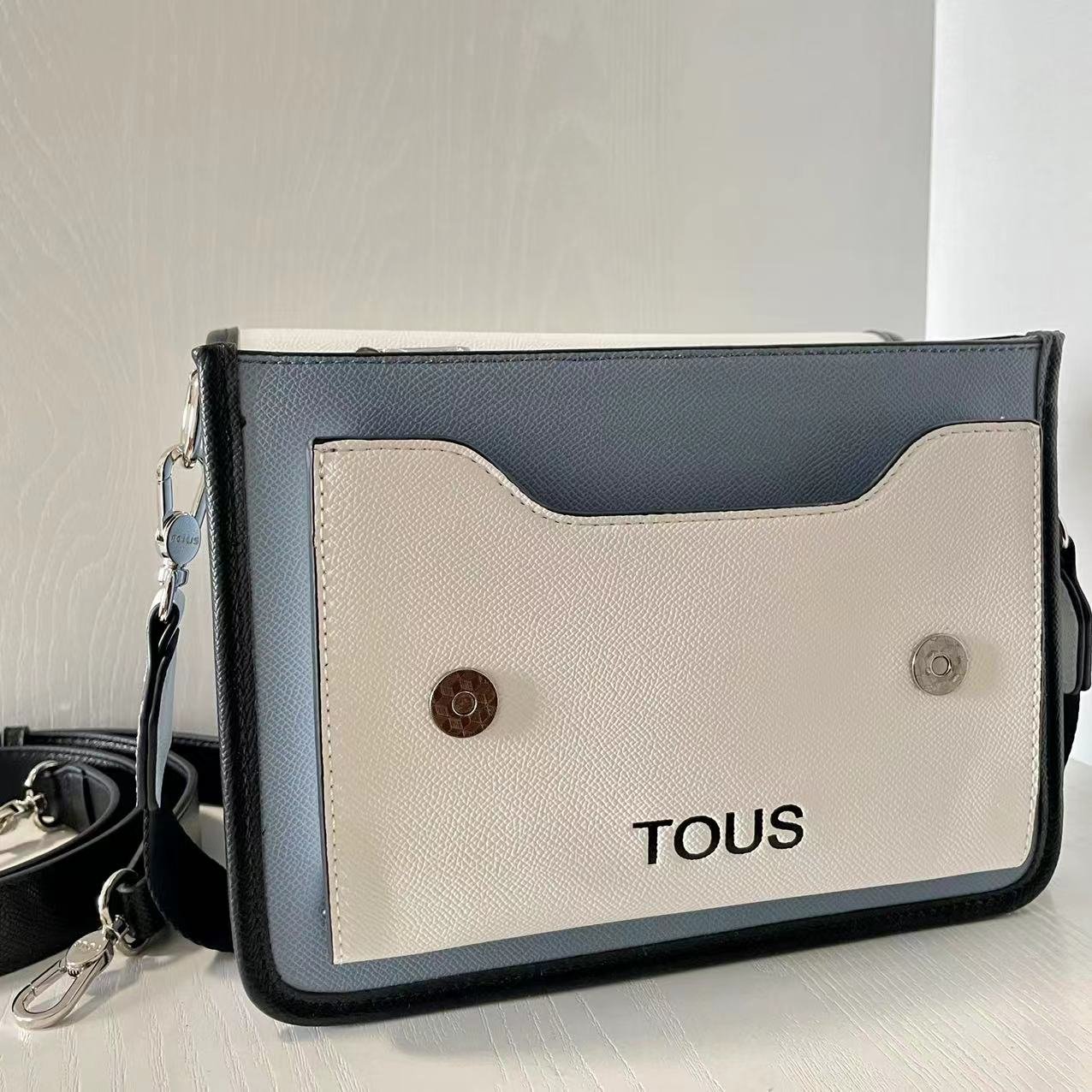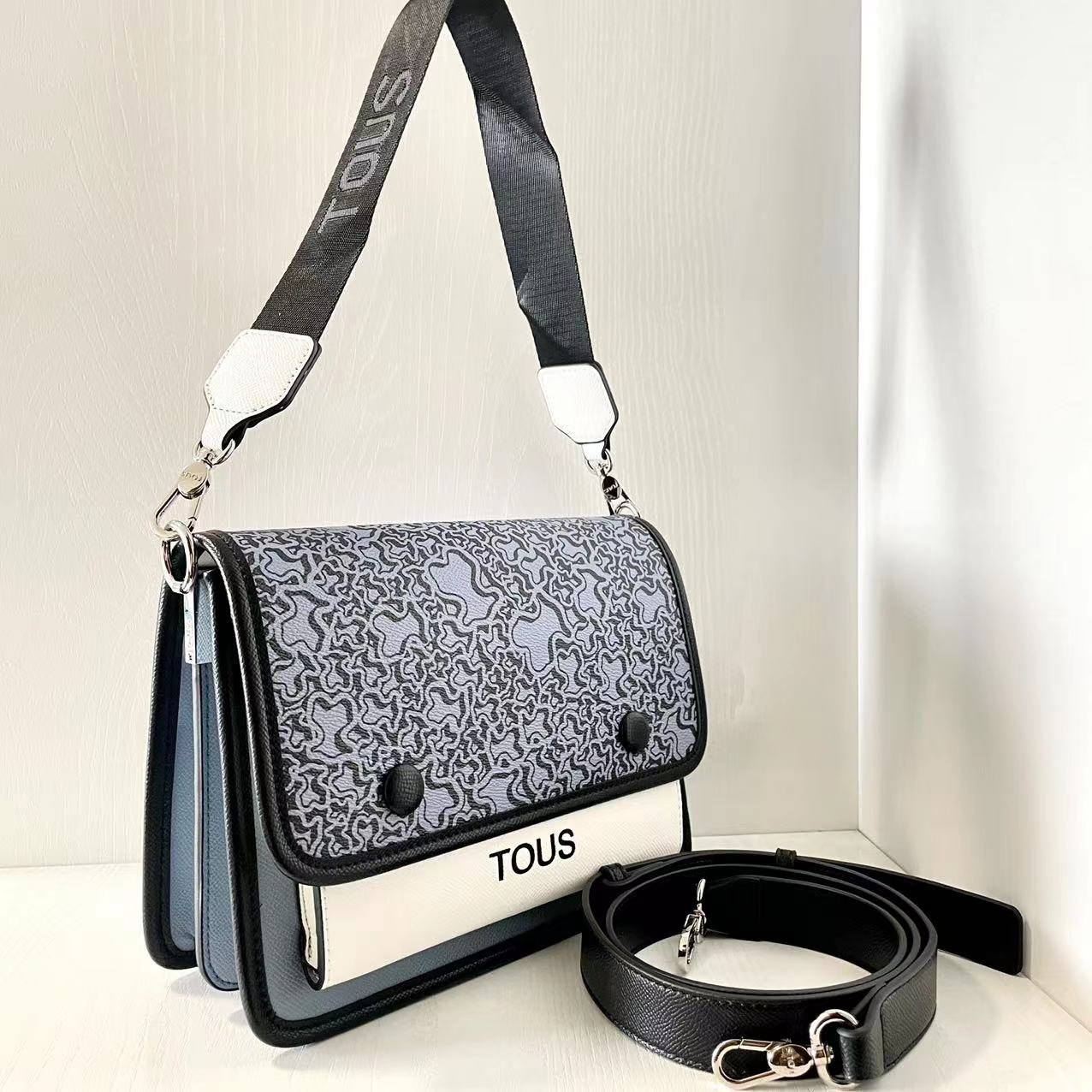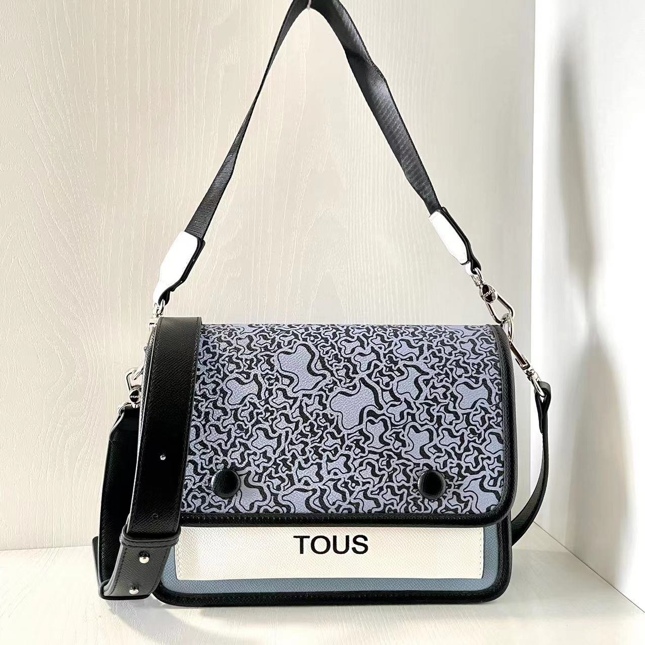 Tous blue and black printed crossbody handbag. There are multiple inner pockets, magnetic buckle openings, adjustable and detachable shoulder straps, and a handbag inside. Measurements: 24.5 * 9 * 20.5cm