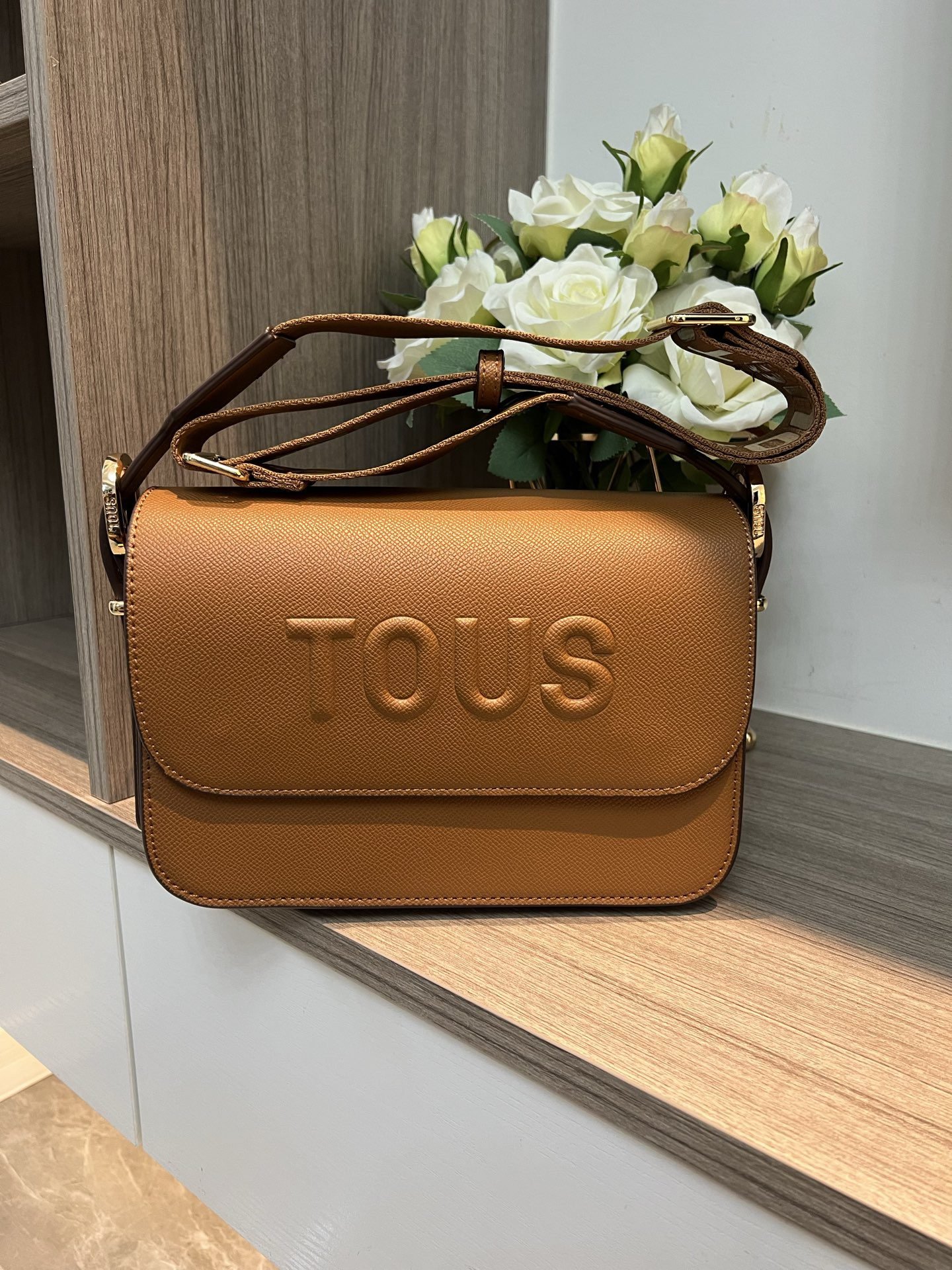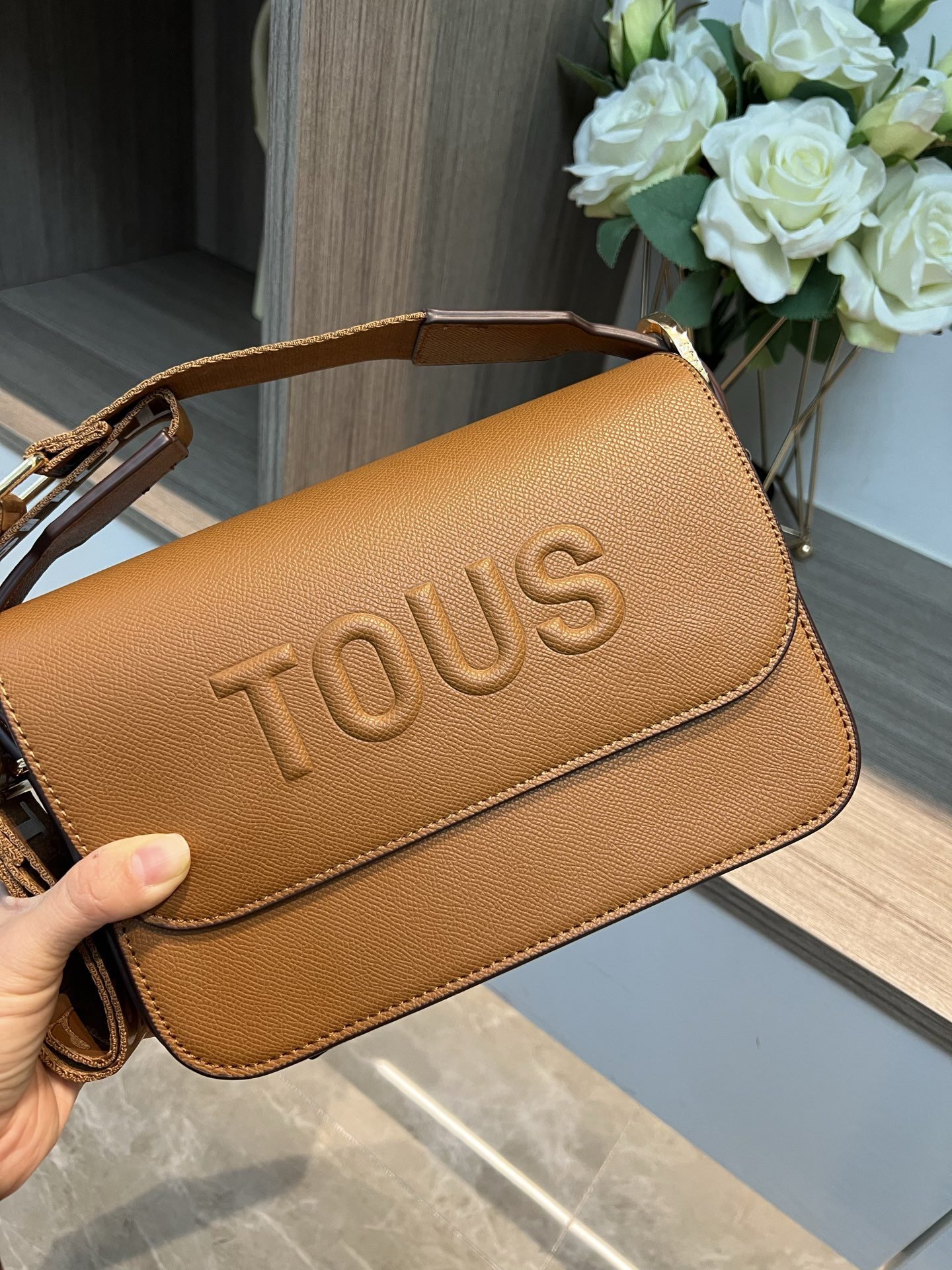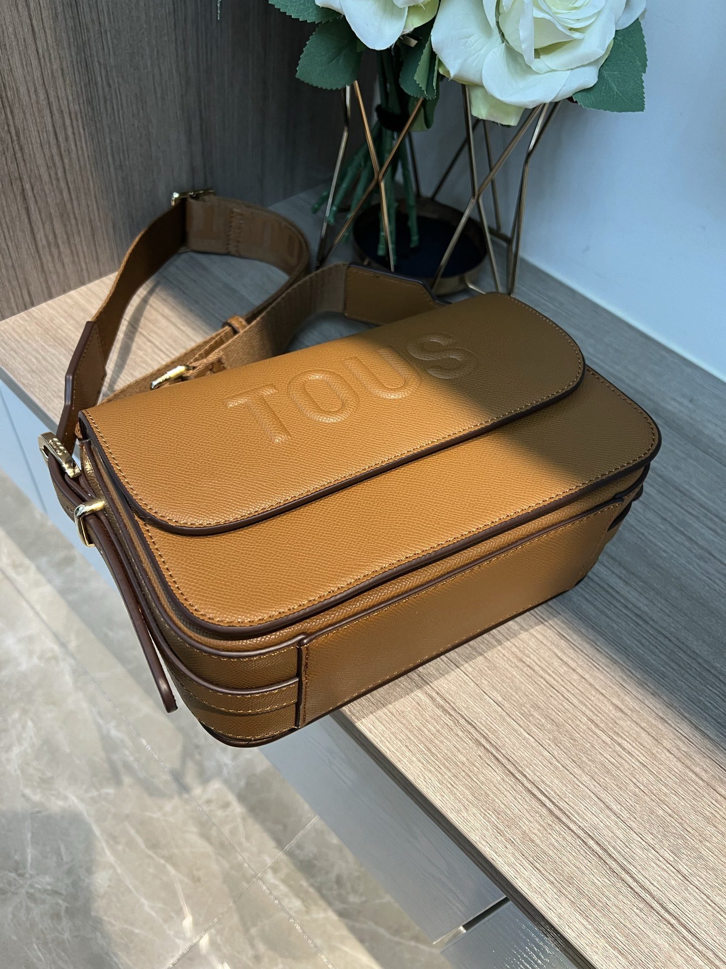 This is a TOUS embossed logo messenger bag, centered on the brand’s 3D embossed logo design. Made of caramel brown leather fabric, it features delicate texture and warm quality, with a retro color tone that fits various styling styles. The bag adopts a flap design, paired with an adjustable wide shoulder strap, supporting two carrying methods: shoulder and crossbody, balancing aesthetics and comfort. Its capacity fits daily personal items, making it a light luxury practical item for commutes, dates and other scenarios, showing elegant retro temperament.