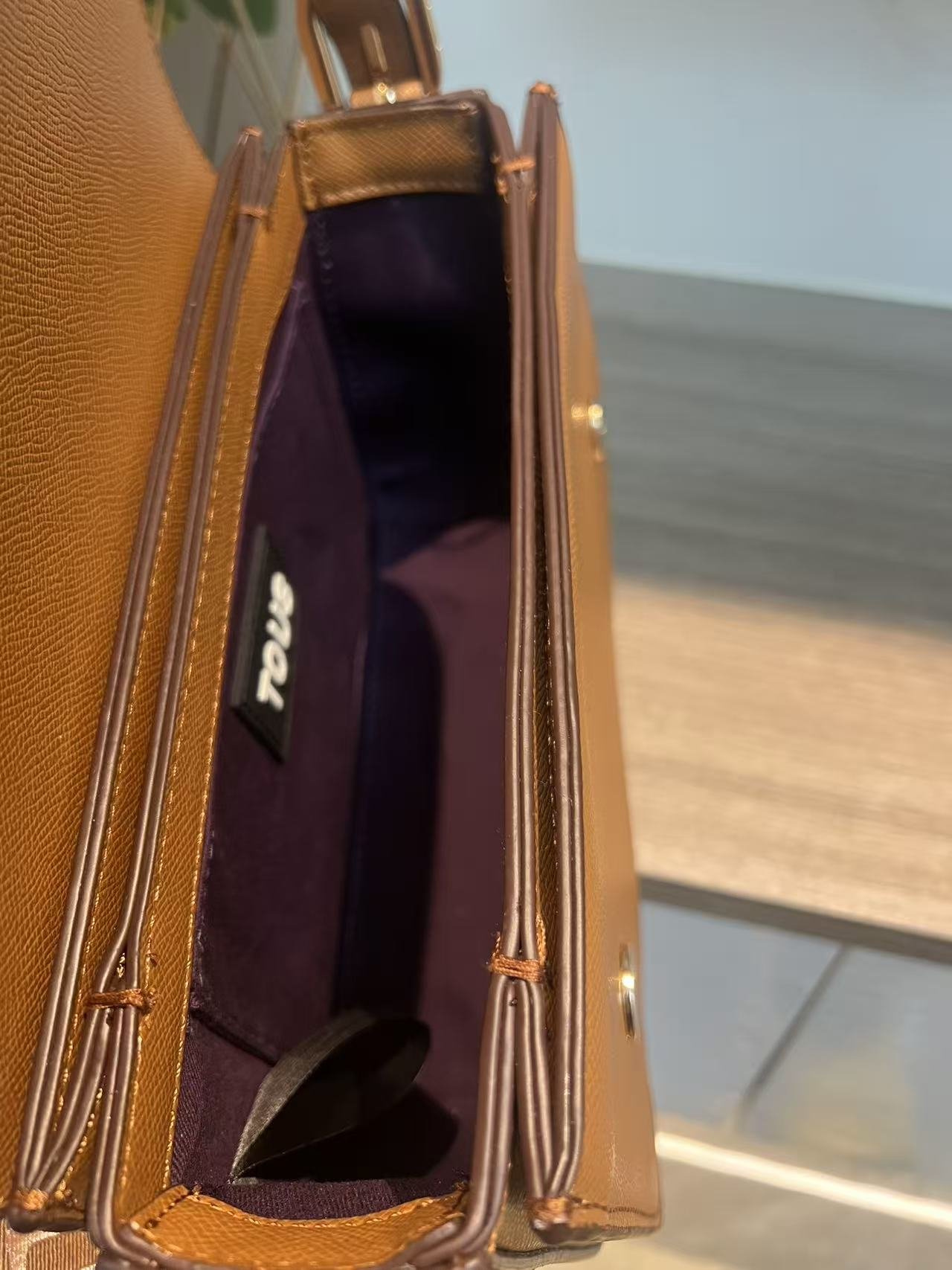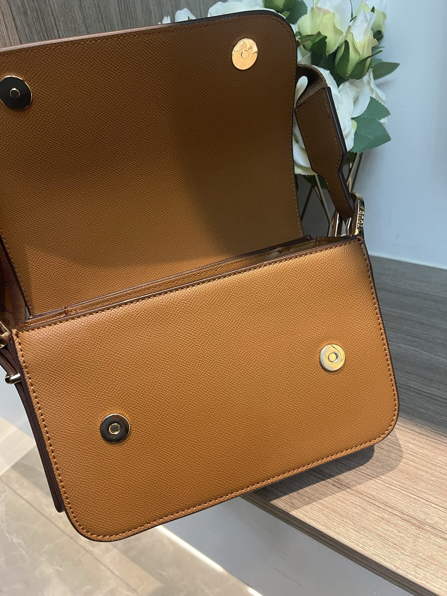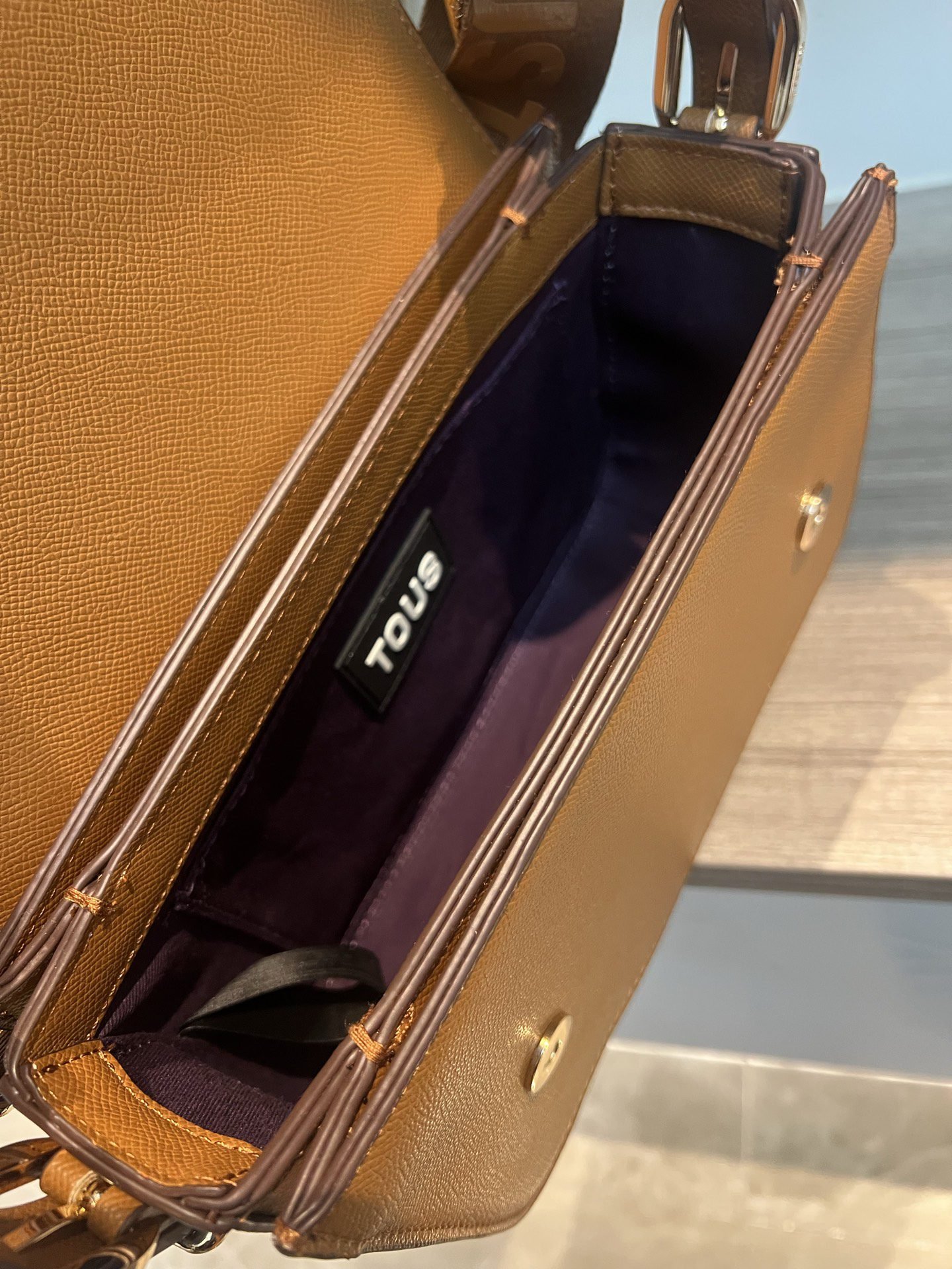 This is a TOUS embossed logo messenger bag, centered on the brand’s 3D embossed logo design. Made of caramel brown leather fabric, it features delicate texture and warm quality, with a retro color tone that fits various styling styles. The bag adopts a flap design, paired with an adjustable wide shoulder strap, supporting two carrying methods: shoulder and crossbody, balancing aesthetics and comfort. Its capacity fits daily personal items, making it a light luxury practical item for commutes, dates and other scenarios, showing elegant retro temperament.