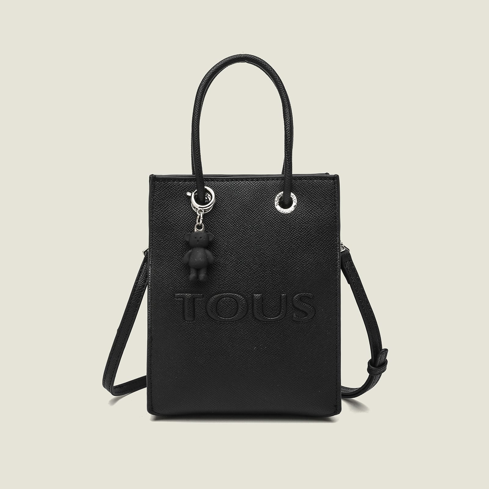 TOUS La Rue Multi tone Synthetic Leather New Popular Mini Bag. Magnetic buttons open and close. Fixed handle and adjustable and detachable crossbody shoulder strap. Featuring beautiful bear pendant details. Measurements: 20 x 16 x 6 cm.