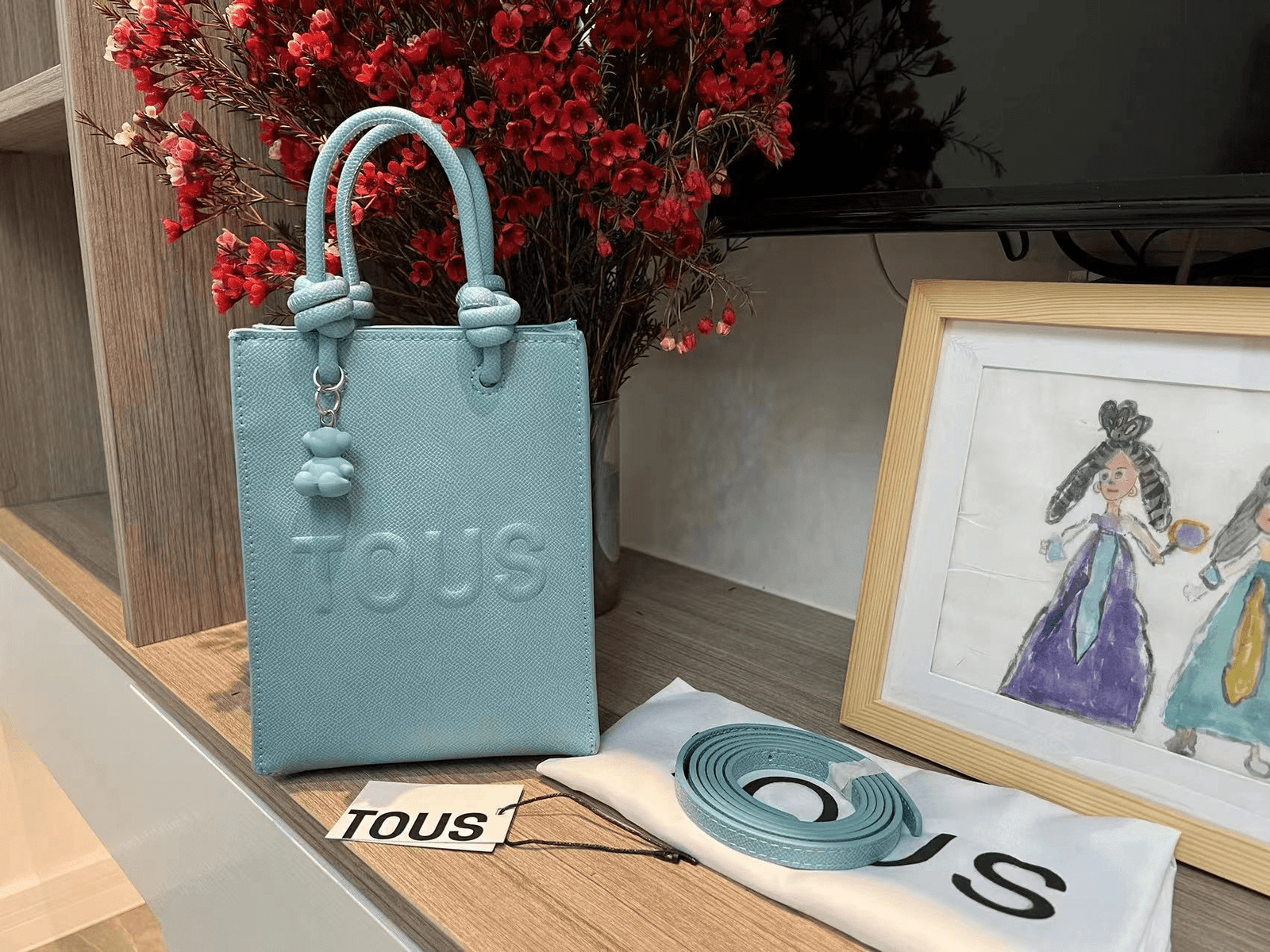 TOUS La Rue multi-color synthetic leather trendy mini bag. Magnetic buttons open and close. Fixed handle and adjustable detachable diagonal shoulder strap. Featuring beautiful bear pendant details. Measurements: 21 x 16 x 6 cm