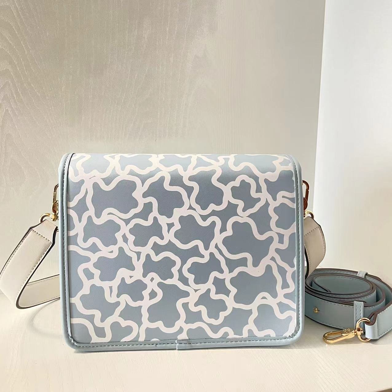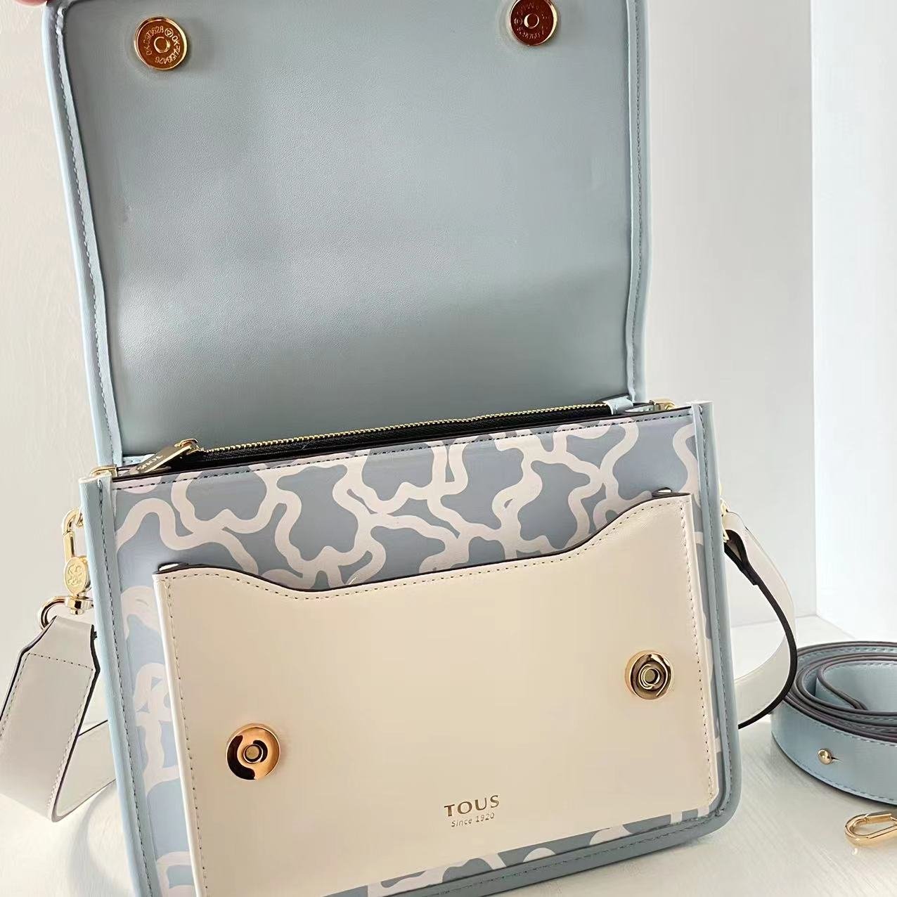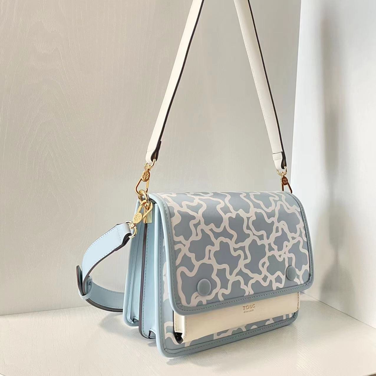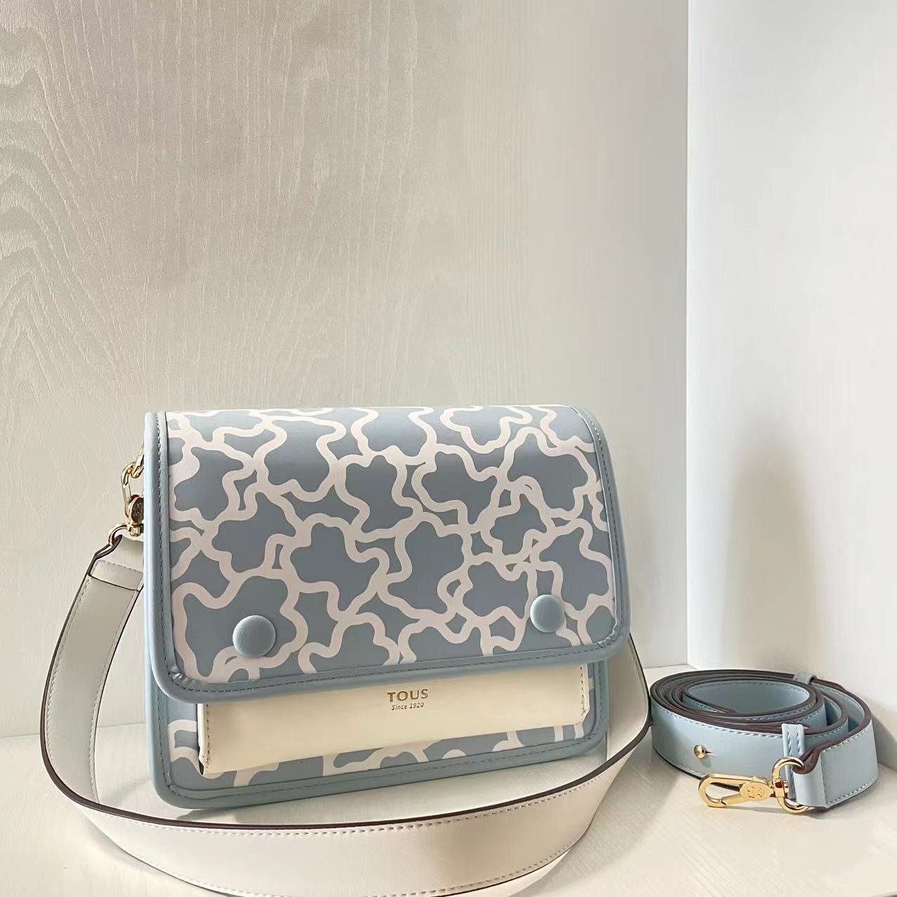 Tous leather medium blue and white Kaos Icon printed crossbody handbag. There are multiple inner pockets, magnetic buckle openings, adjustable and detachable shoulder straps, and a handbag inside. Measurements: 24.5 * 9 * 20.5cm