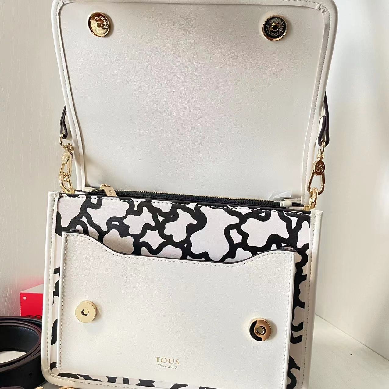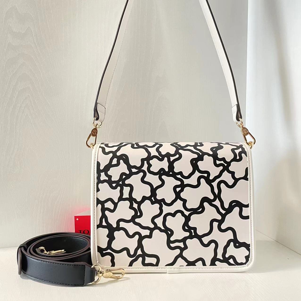 Tous leather medium white and black Kaos Icon printed crossbody bag. There are multiple inner pockets, magnetic buckle openings, adjustable and detachable shoulder straps, and a handbag inside. Measurements: 24.5 * 9 * 20.5cm