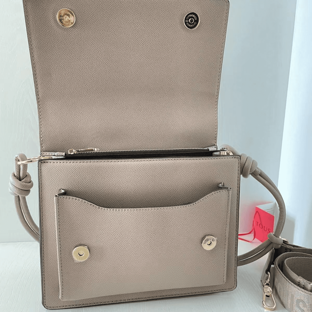 Medium TOUS La Rue New Audree apricot synthetic leather crossbody bag. Equipped with flip and open/close buttons, as well as two magnetic buttons. It has two compartments, one with a zipper and an open pocket in the front. Fixed shoulder straps and detachable and adjustable cross straps.