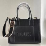 TOUS Medium Black La Rue Amaya Synthetic Leather Shopping Bag. Magnetic buttons open and close. Open the front pocket. There is a zippered pocket inside and two open pockets. Secure the handle and shoulder strap. Measurements: 28 * 13 * 22cm