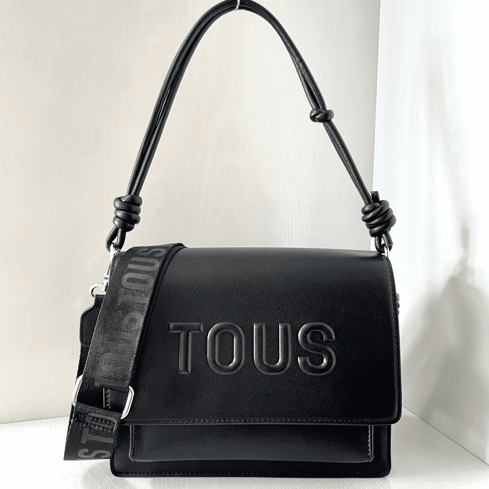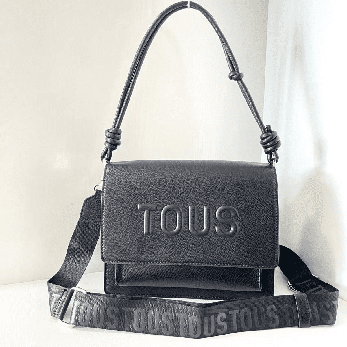 Medium TOUS La Rue New Audree black synthetic leather crossbody bag. Equipped with flip and open/close buttons, as well as two magnetic buttons. It has two compartments, one with a zipper and an open pocket in the front. Fixed shoulder straps and detachable and adjustable cross straps.