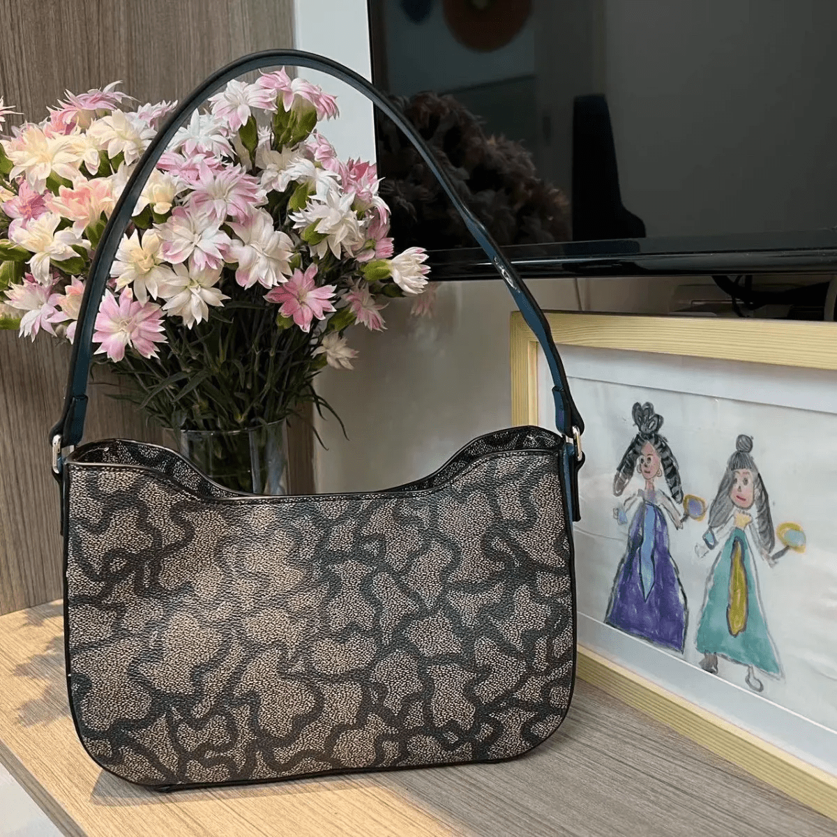 TOUS Medium Blue and Black Kaos Icon Printed Shoulder Bag Underarm Bag. Made of waterproof canvas, combined with leather effect vinyl, the shoulder strap is non adjustable, and the zipper opens and closes. There are multiple interlayers inside. Measurements: 25 * 7 * 16.5cm
